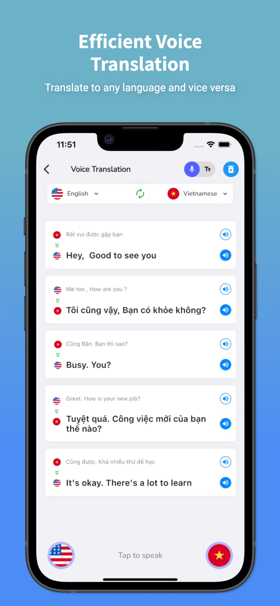 Real-time speech translator to both text and audio, tap-to-play again and learn speaking languages.