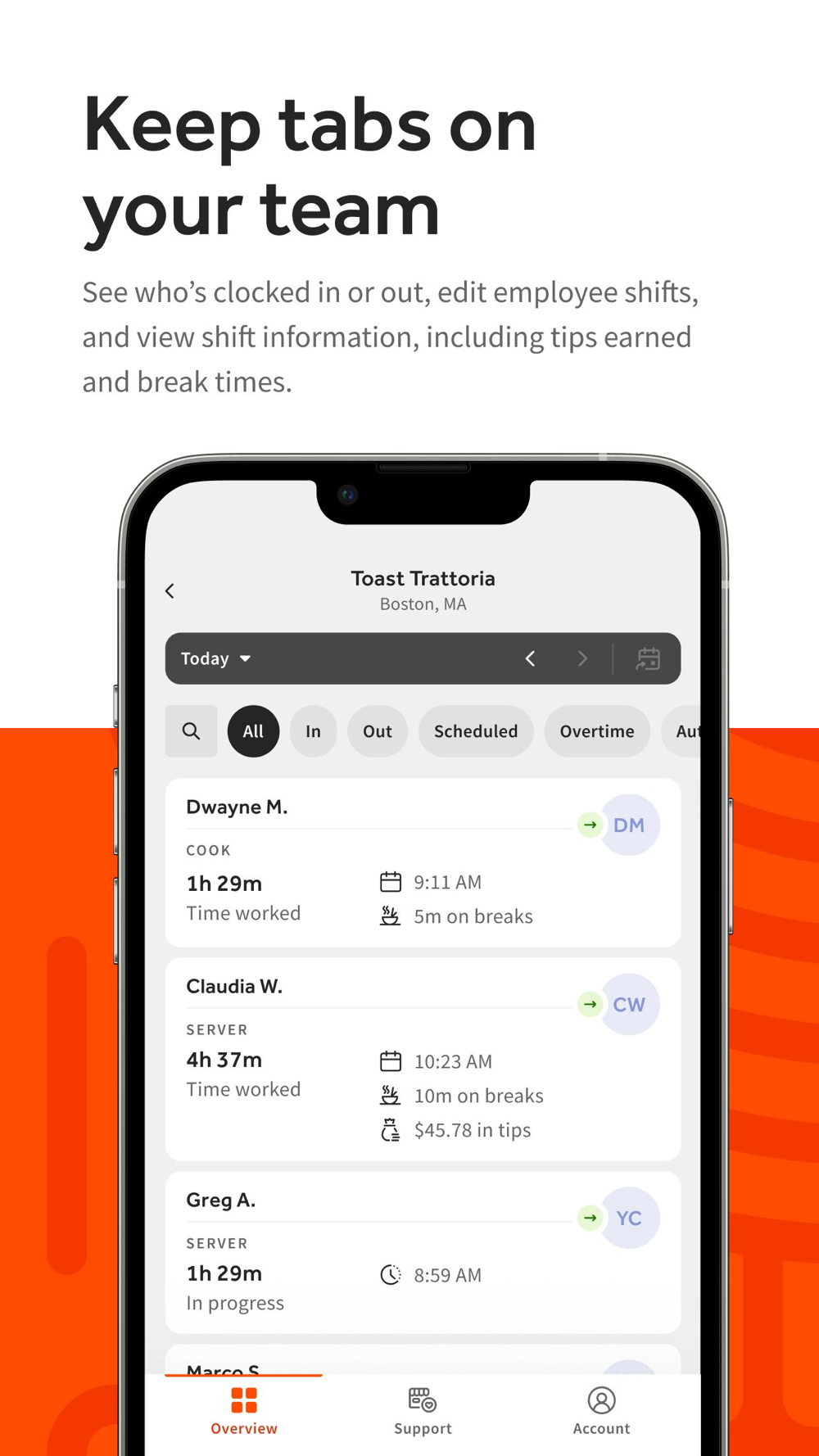 See who’s clocked in or out, edit employee shifts, and view shift information, including tips earned and break times.