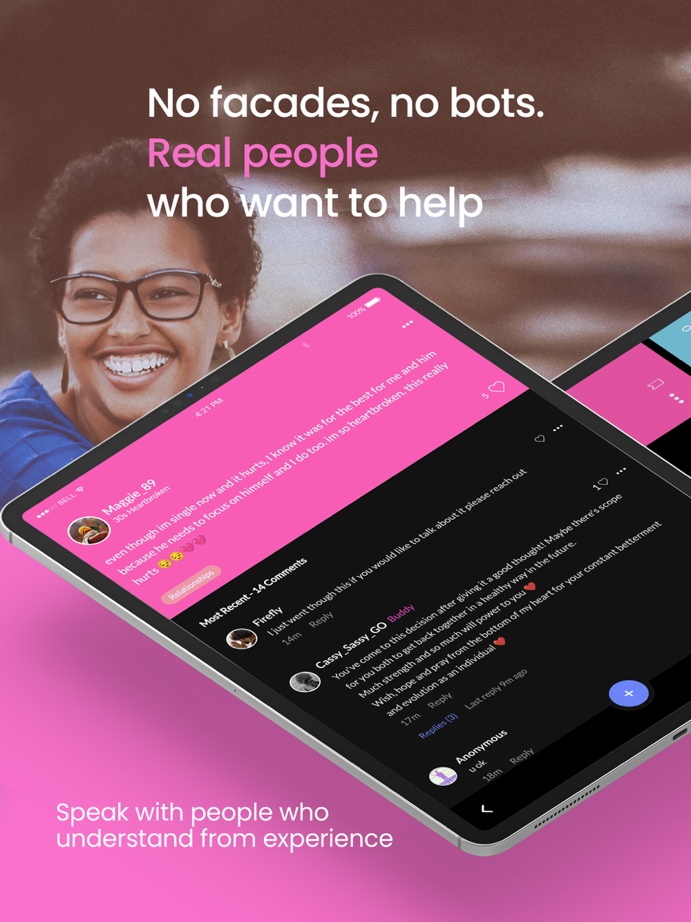 +100% anonymous. Talk about life’s struggles in a safe and confidential environment. We’re super serious about anonymity and helping you share safely.