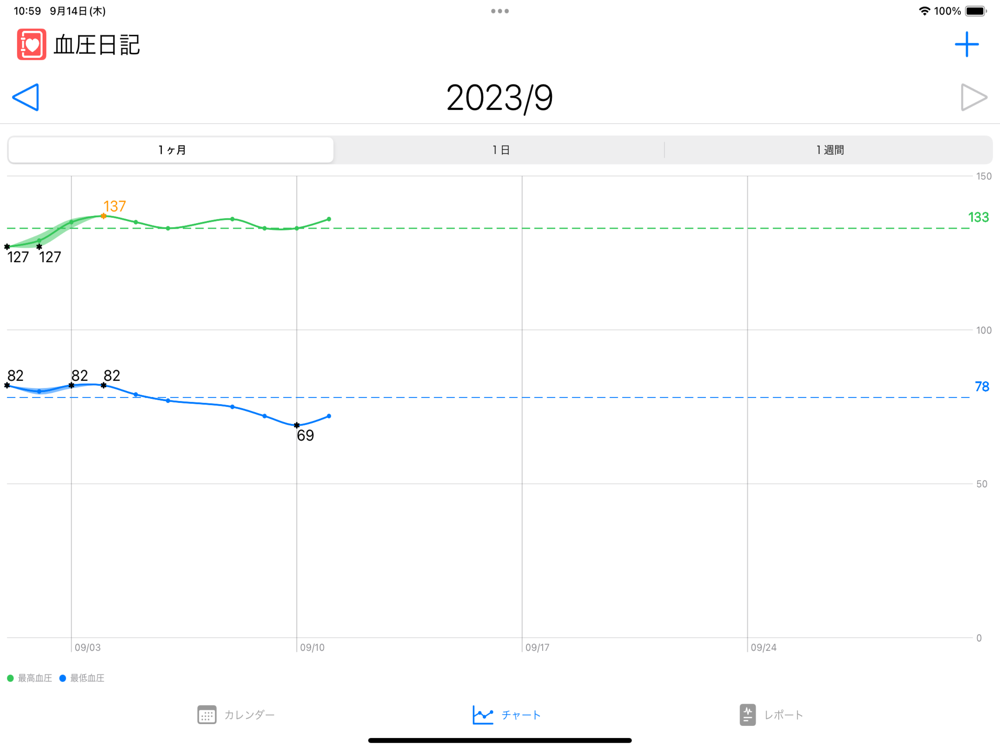 ■Apple Watchで記録(最高血圧・最低血圧と心拍数)の履歴(約1週間)を確認できます。