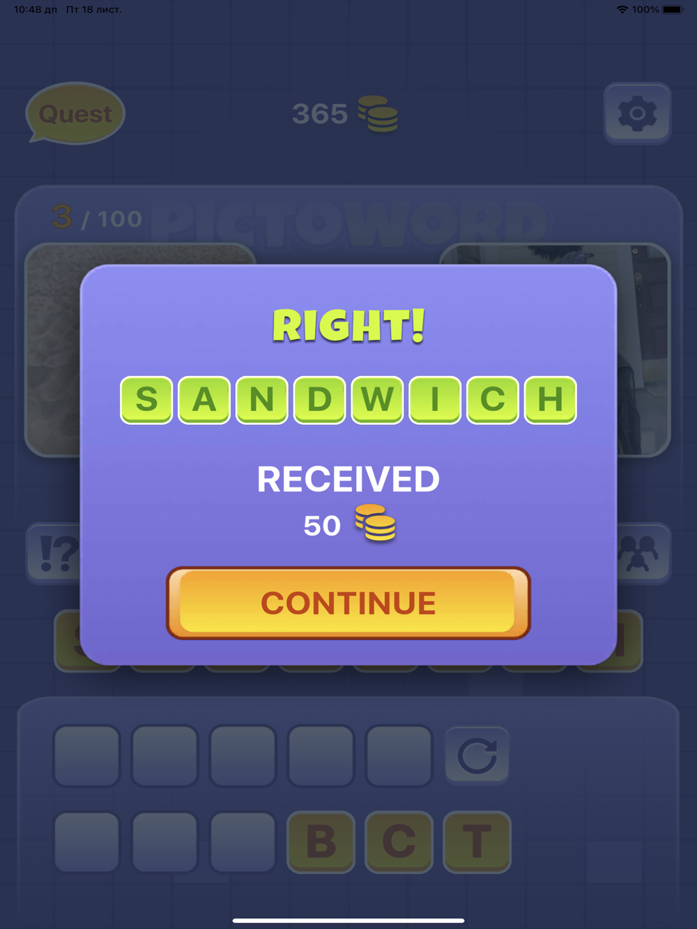 Complete daily game quests and get in-game currency for which you can buy tips, such as skip a level, remove one letter, show one letter, show the word from a picture. If you make a mistake and guess the word incorrectly, you can try again. You can turn on the Dark Mode to save your eyesight in the dark.