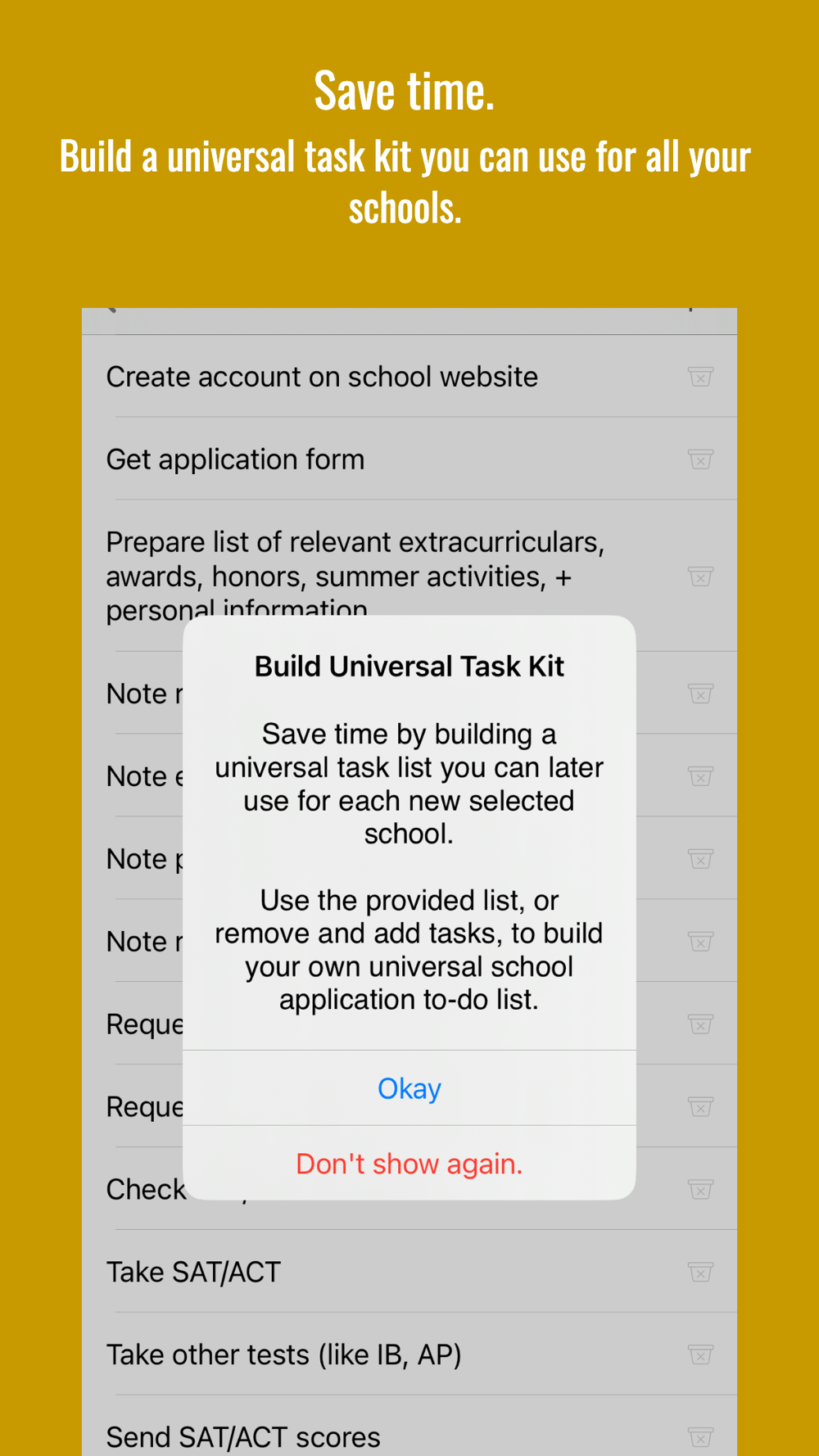 Once you've decided which schools you want to apply to, build a universal task list to use with each school. Use some or all of the available tasks, or add your own. Add the schools to your list, add deadlines, and take notes. Track by school or deadline.