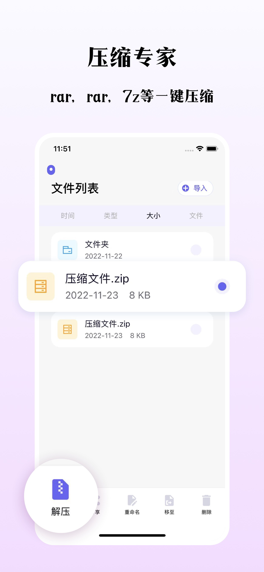 压缩专家是一款简洁易用的解压压缩软件,可支持解压zip、rar、7z 等压缩格式,支持直接打开视频、图片、文档等。一键解压缩,一键分享文件等,可快速处理文件,提高您的效率。