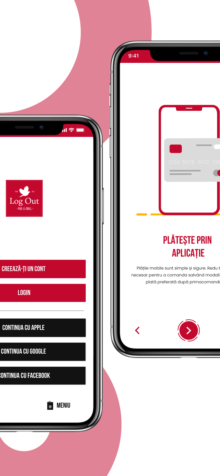 Pentru toți clienții noștri fideli, am creat aplicația Log Out Pub. Acum te poți bucura oricând de produsele noastre direct prin intermediul aplicației mobile. Comandă și plătește prin intermediul aplicației. Selectează metoda de livrare preferată, îți livrăm comanda aleasă, poți ridica comanda sau ne întâlnim chiar la jumătatea drumului. De asemenea, te așteptăm în incinta restaurantului nostru pentru a încerca cele mai noi delicatese pregătite pentru tine.