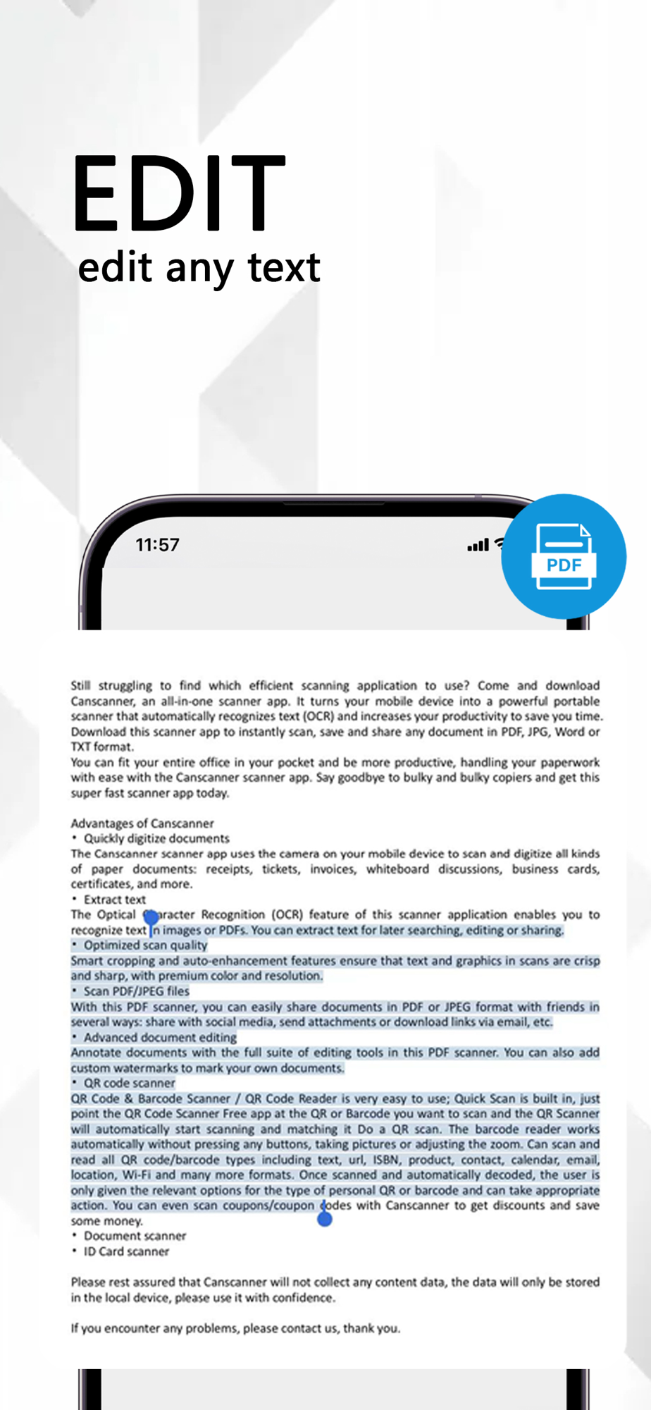 Still struggling to find which efficient scanning application to use? Come and download Canscanner, an all-in-one scanner app. It turns your mobile device into a powerful portable scanner that automatically recognizes text (OCR) and increases your productivity to save you time. Download this scanner app to instantly scan, save and share any document in PDF, JPG, Word or TXT format.