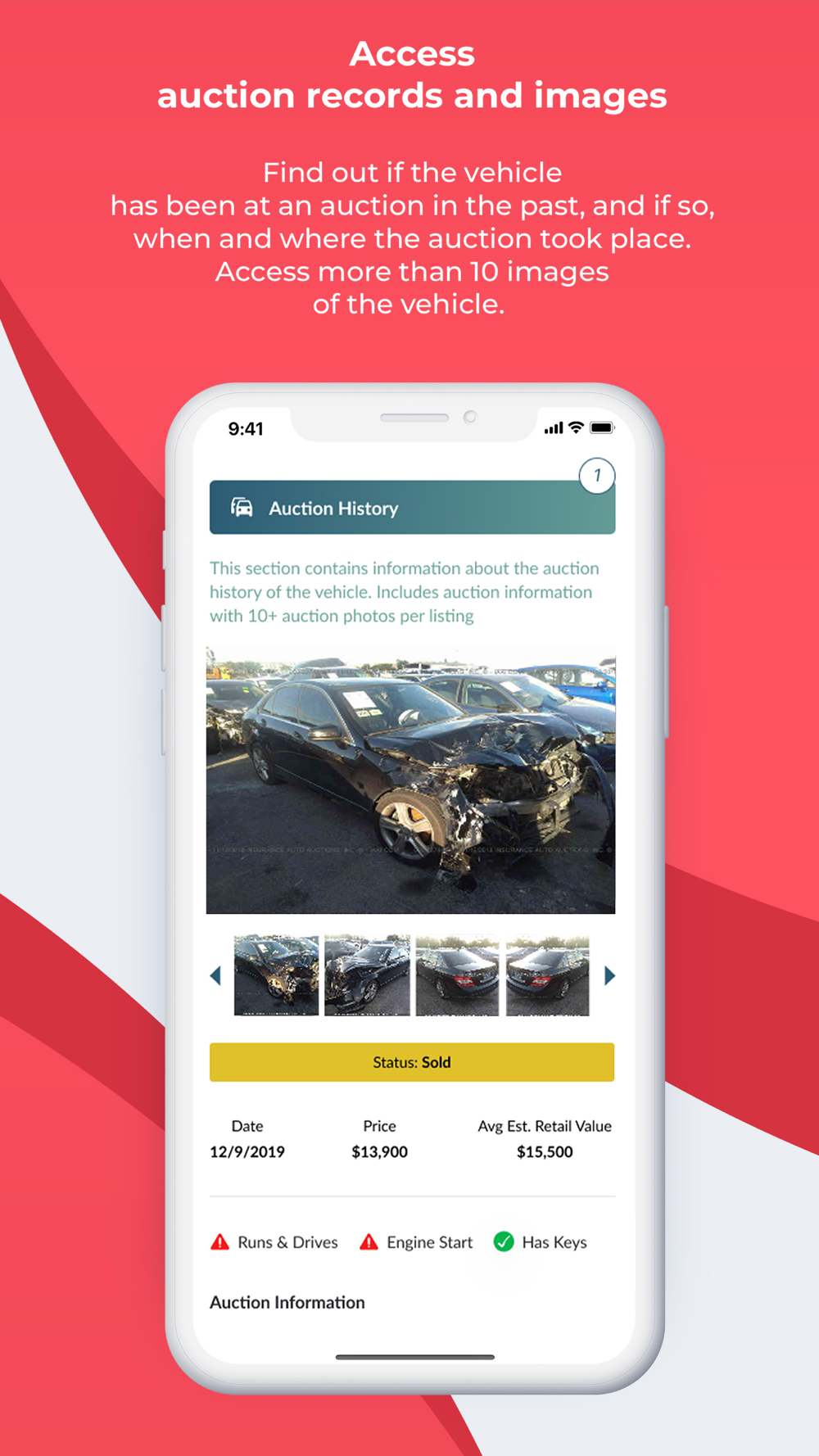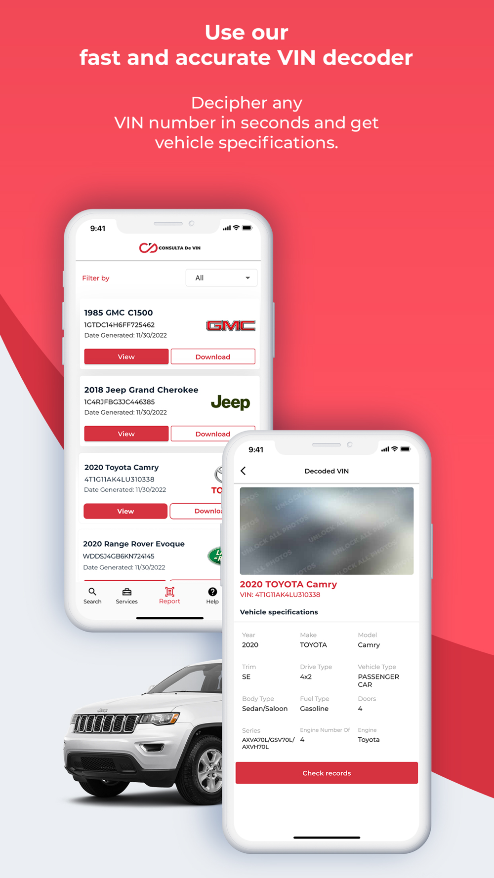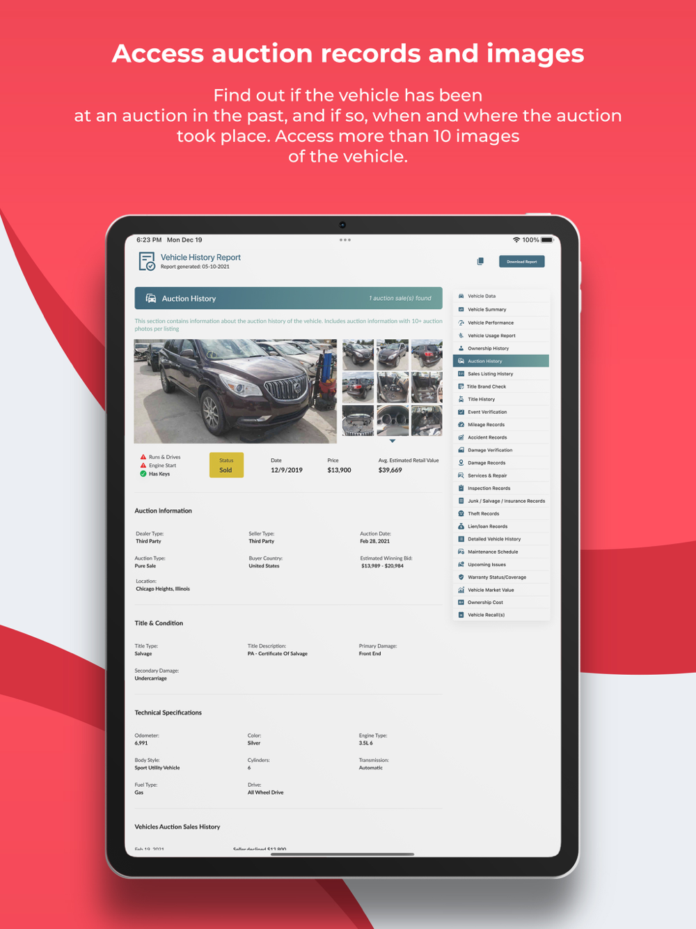 The fastest, easiest and most accurate way to get information about any vehicle from the VIN number. Generate the history report for any used vehicle using our VIN decoder. Includes free access to vehicle specifications. Run a VIN Check Now! With your checkup you can quickly access detailed information, including accident history, mileage history, theft records, auction and photo history, loan and lien records, damages, maintenance history, open withdrawals, and much more. We offer the best alternative to Carfax, including much more data in our reports and at a more affordable price.