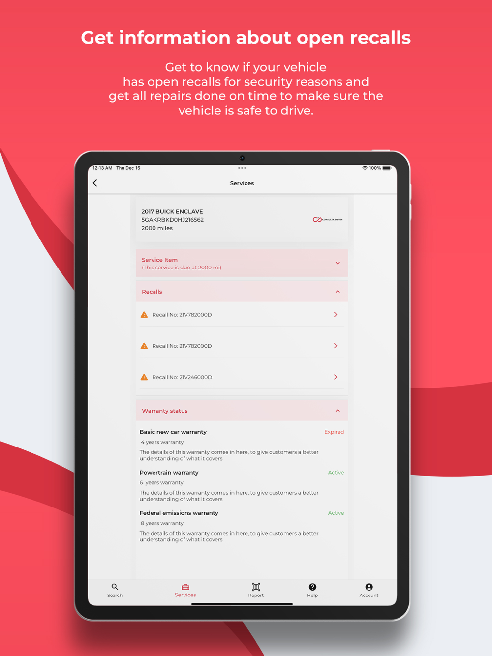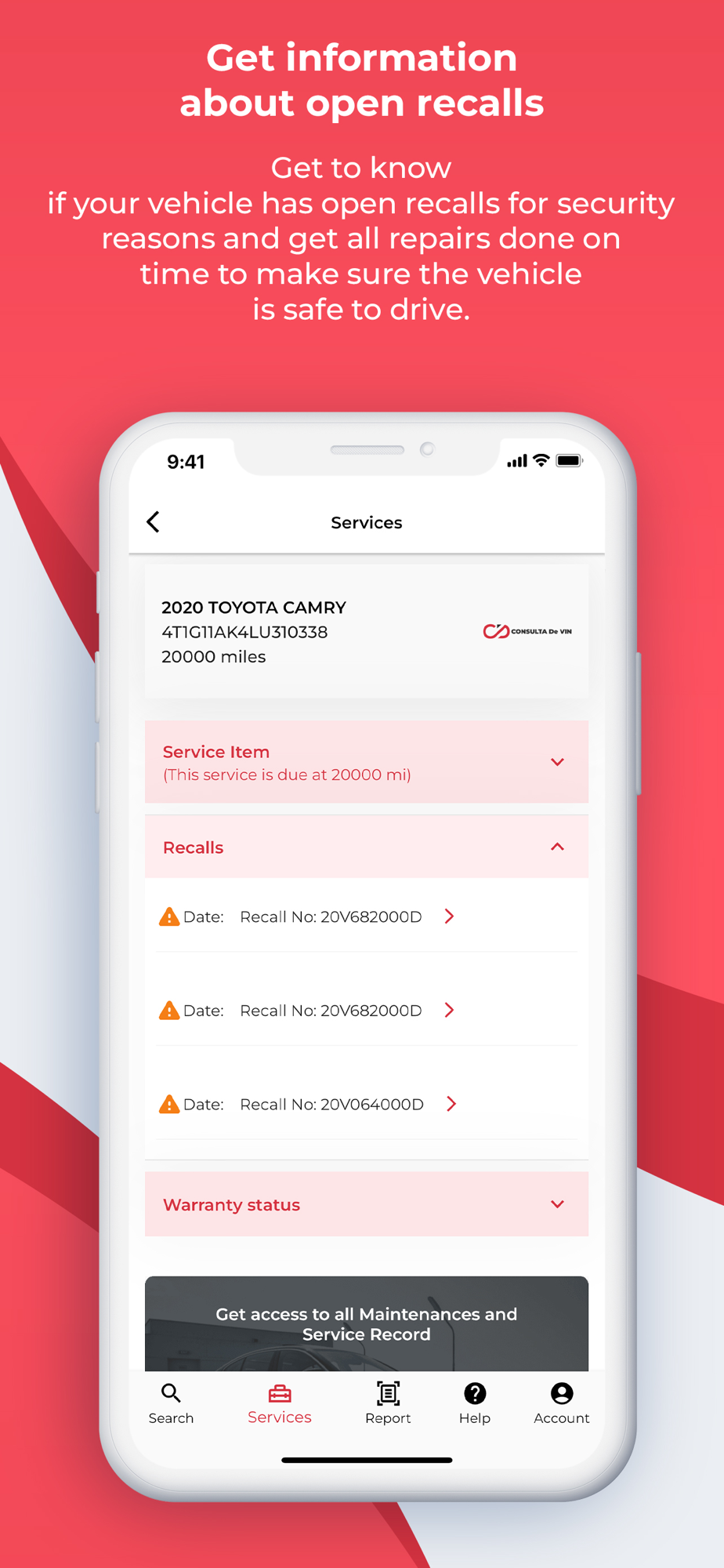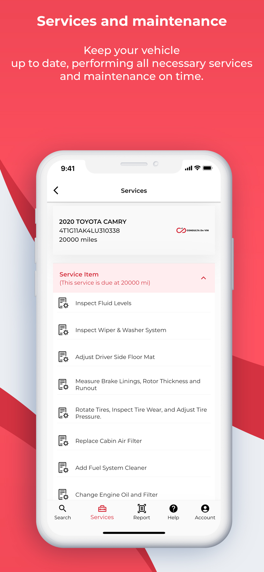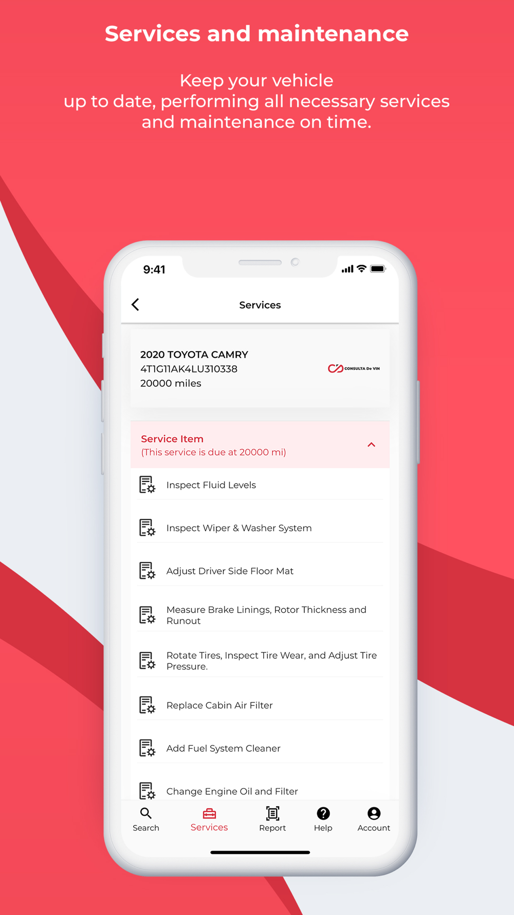 • Services and upcoming maintenance (based on VIN and number of miles/kilometers)