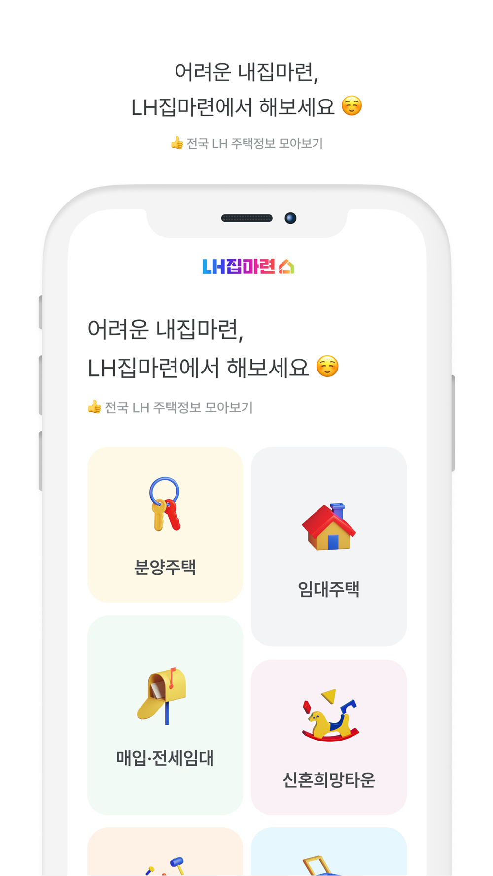 - 토지, 분양주택, 신혼희망타운, 임대주택, 매입임대/전세임대, 상가에 대한 정보를 쉽게 확인해보세요