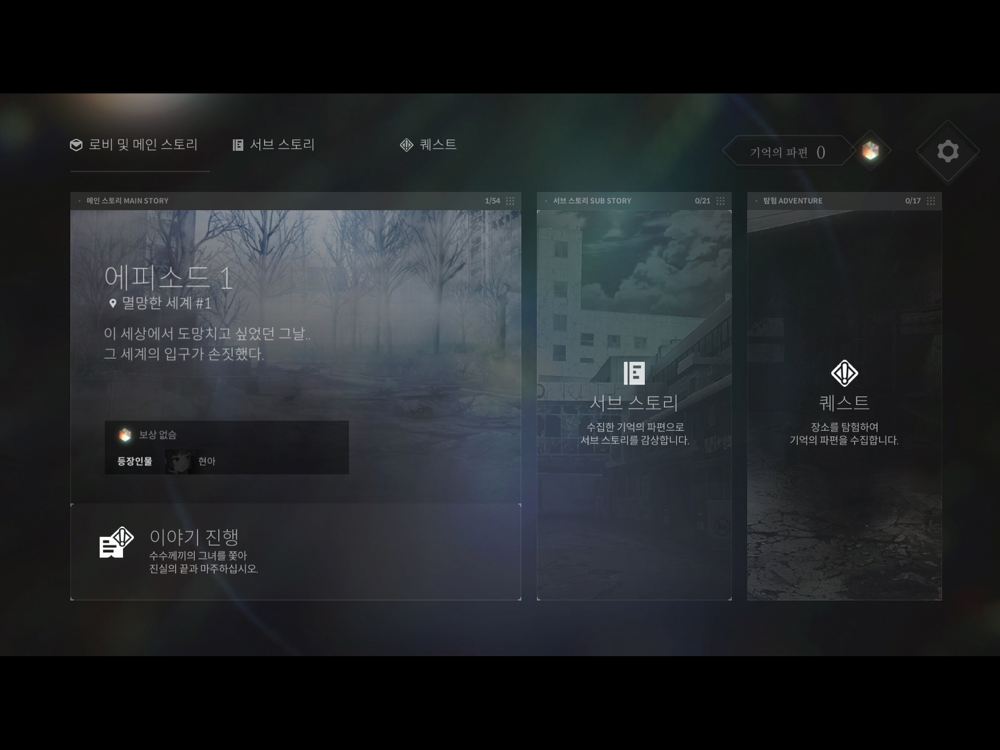 메인스토리와 퀘스트를 수행하면 받을수있는 [기억의 파편]으로 좀더 부가적인 재미를 느낄수있습니다. 소소한 이야기가 담긴 서브 스토리와 퀘스트에서 사용할수있는 히로인의 캐릭터 스킨을 수집해 보세요.