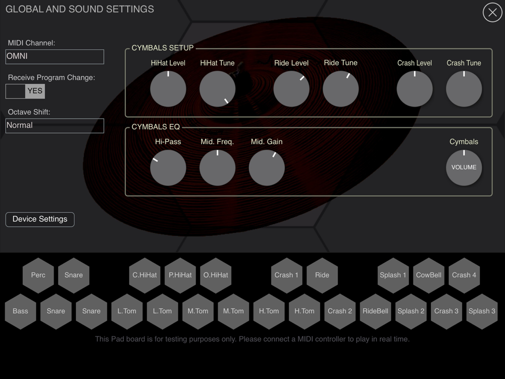 - Separate section with adjustments for Cymbal sounds (tuning, leveling and EQ)