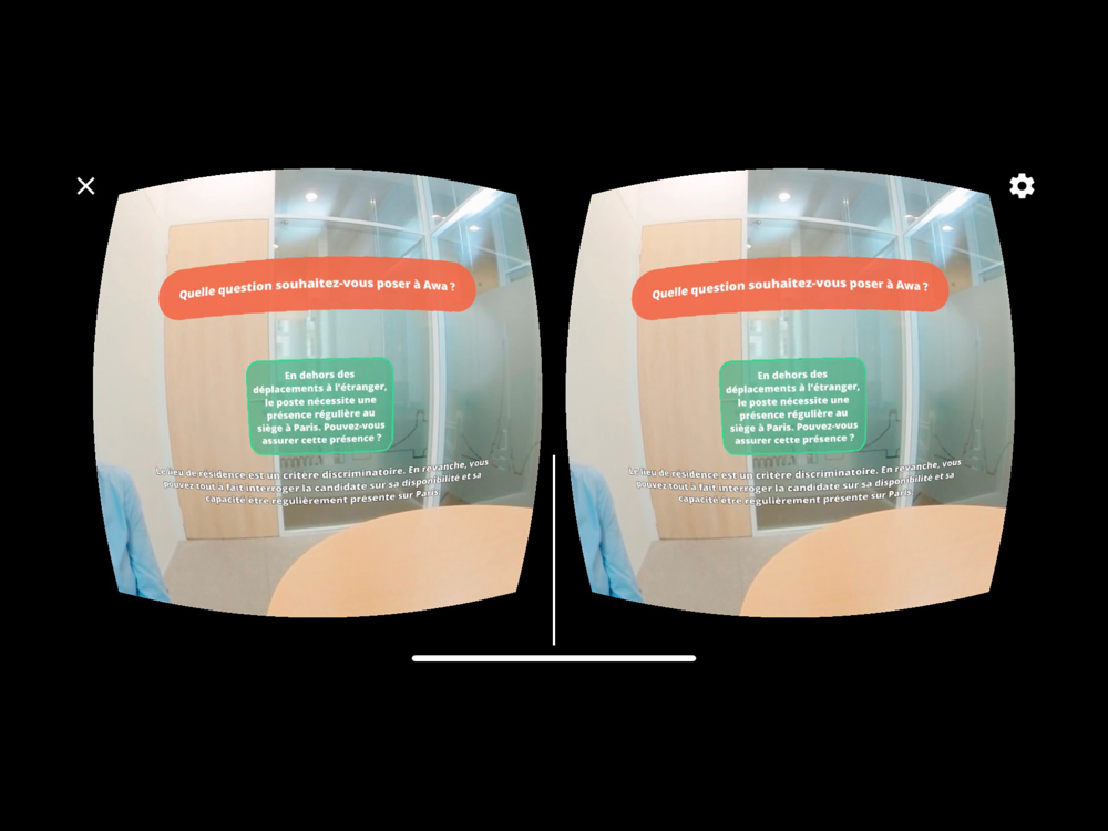 "La simulation d’entretien : recruter sans discriminer" est une application VR (compatible avec une visionneuse Cardboard ou un masque VR), conçue par À Compétence Égale qui vous permet de vivre une véritable mise en situation d’un entretien d’embauche avec un.e candidate. Vous allez en effet pouvoir lire un descriptif de poste, consulter les CV de deux candidats puis mener un entretien avec chaque candidat.e en choisissant les bonnes questions parmi celles qui sont proposées. L’objectif est de savoir mieux formuler les questions posées en entretien afin de respecter les principes d’égalité de traitement et de non-discrimination.