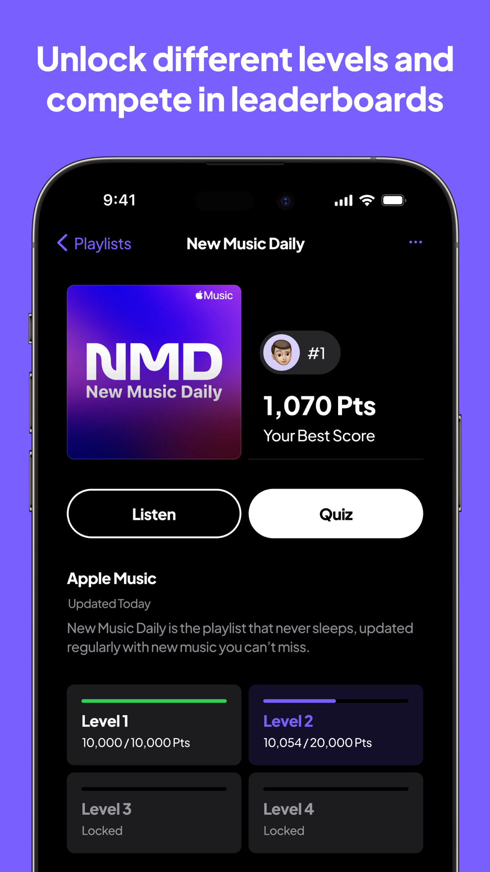 • Guess the title, artist, album, or year of songs and earn points to unlock different levels.