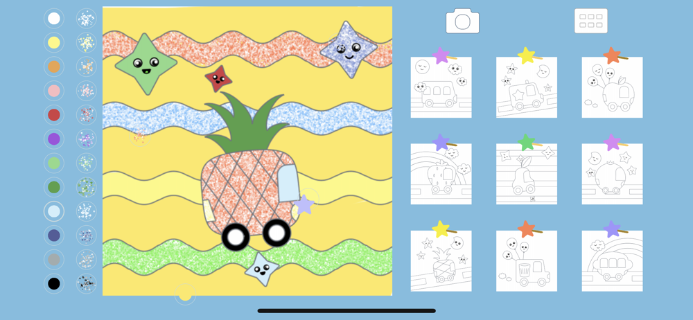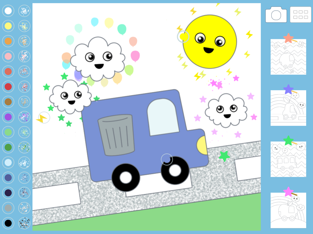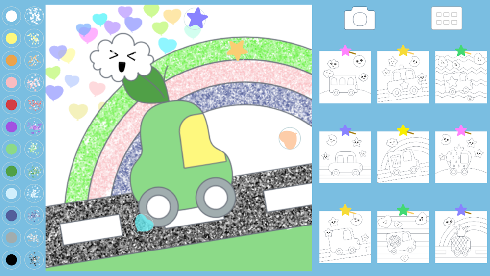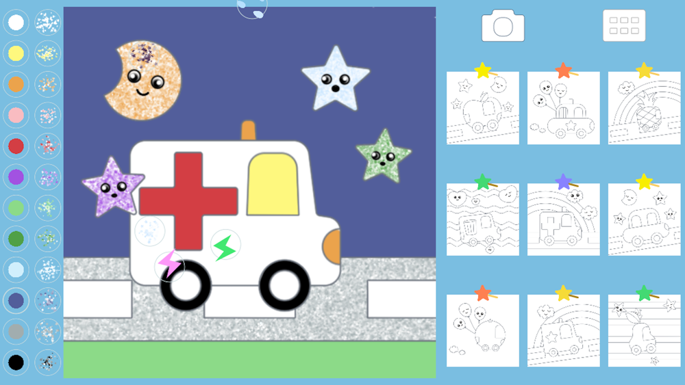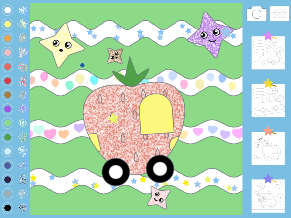 You can coloring endless pictures of cars, police cars, fire trucks, ambulance, school bus, apple car, pear car, strawberry car, lemon car, pineapple car, orange car...