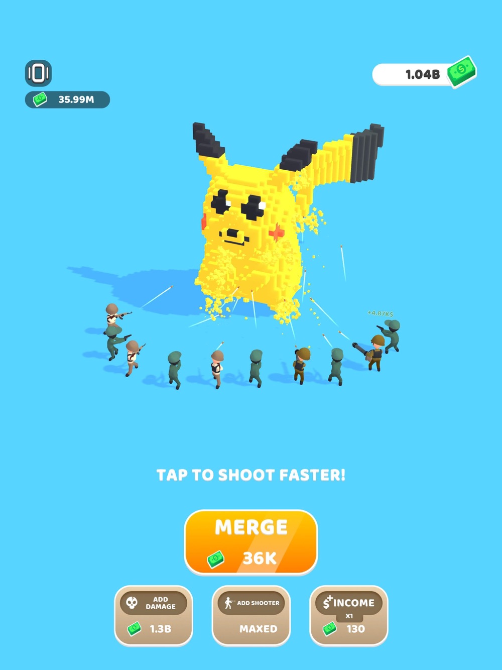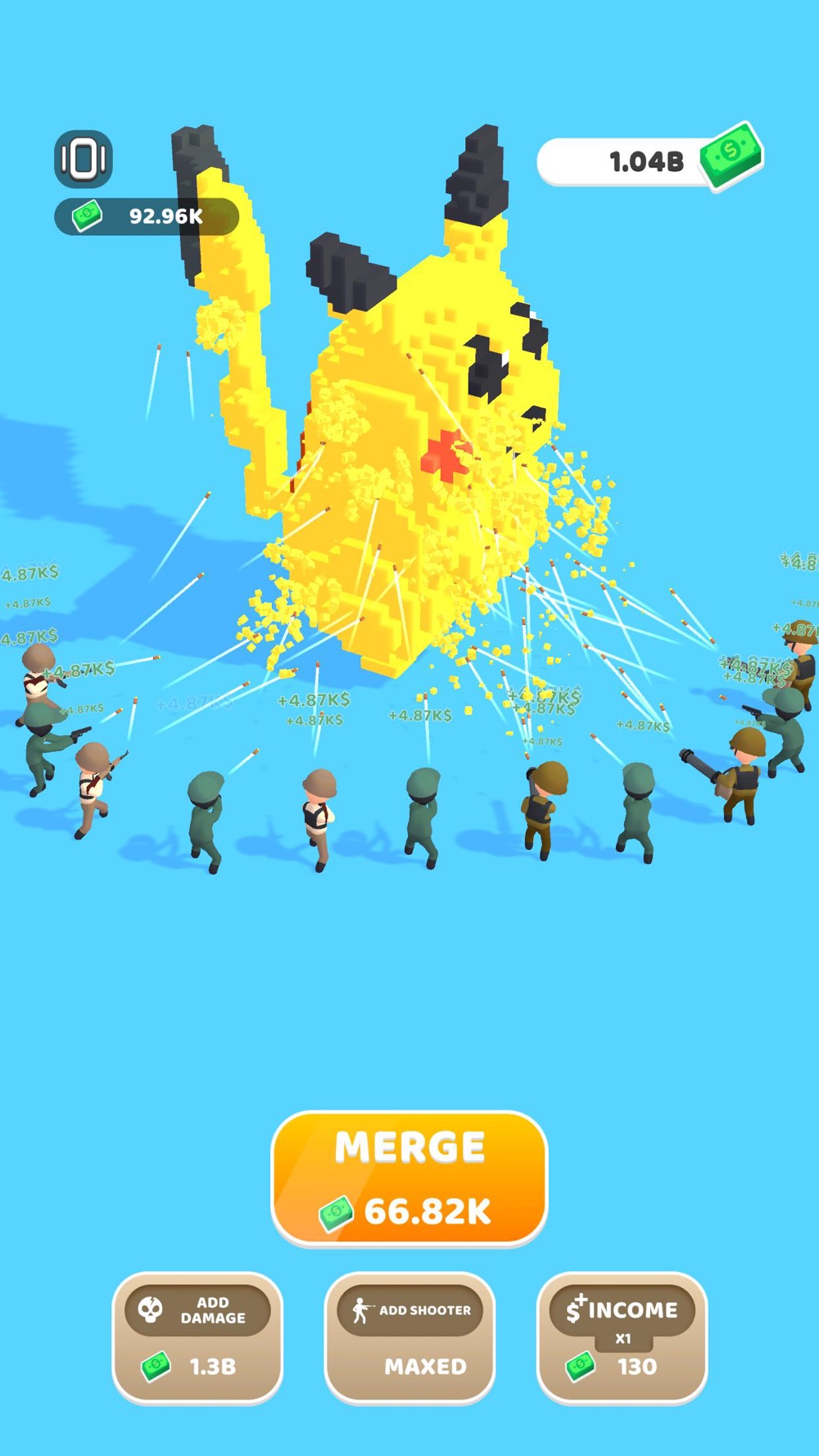 Click to add new soldiers, merge to upgrade them and improve your firepower! Destroy the main object !
