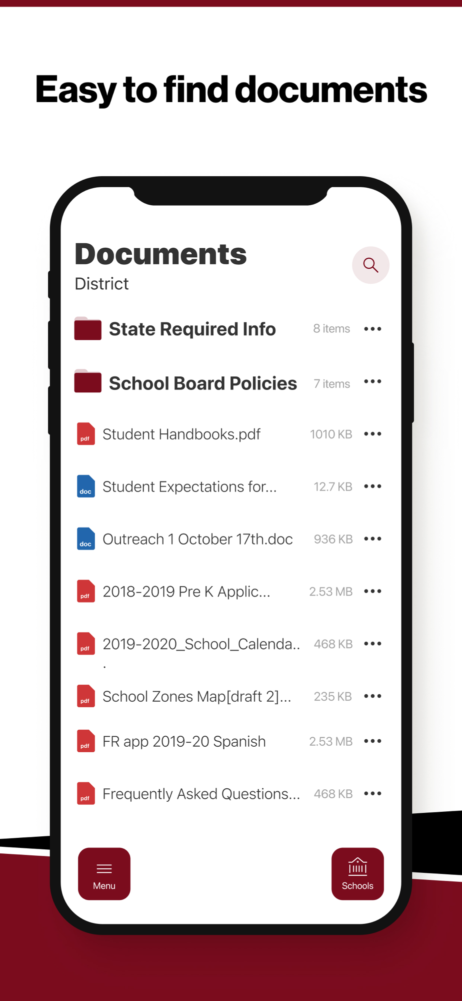 The event section shows a list of events throughout the district. Users can add an event to their calendar to share the event with friends and family with one tap.