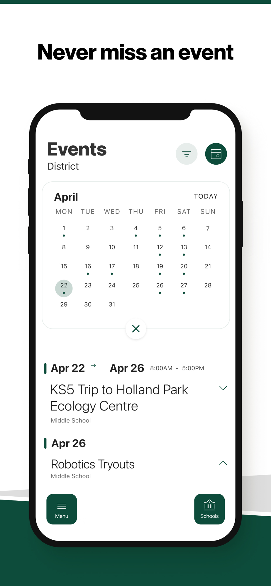 The event section shows a list of events throughout the district. Users can add an event to their calendar to share the event with friends and family with one tap.