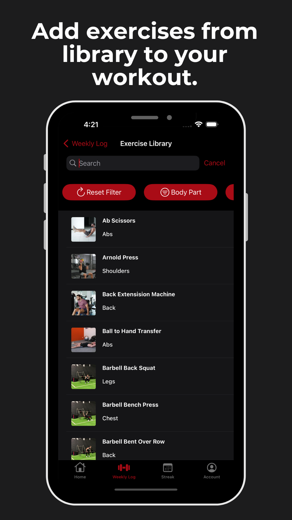 • Filter exercises by body part: Find exercises that target specific body parts and add them to your workout