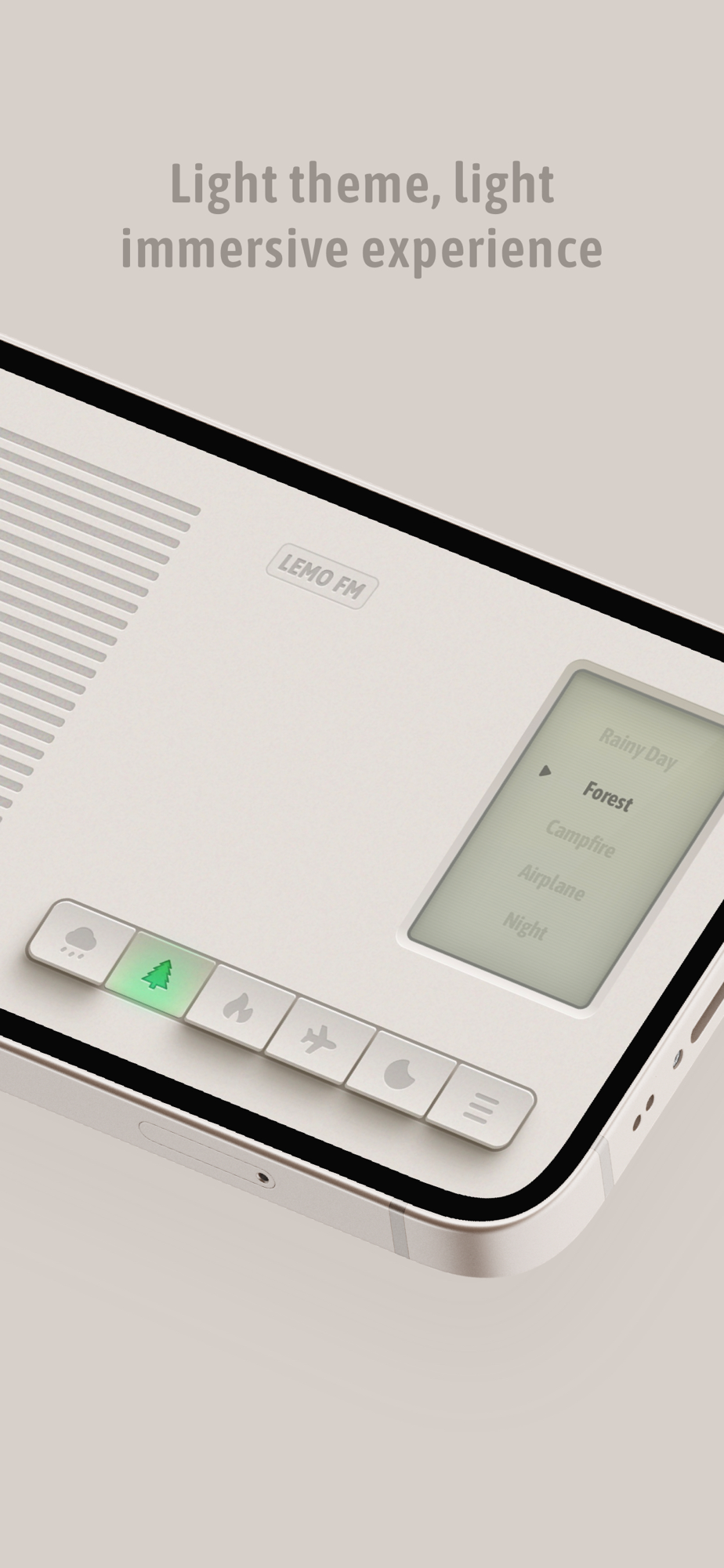 LEMO FM is an ultra-simple, elegant white noise App designed to help users achieve better sleep quality, resolve insomnia and anxiety issues and ultimately lead healthier lives. By playing high-definition natural sounds, it allows you to focus, relax, or fall asleep quickly, and achieve a healthier lifestyle and sleep. Under the philosophy of "Less is more," we designed LEMO FM. Its interface is a simple and elegant radio design. When your finger touches the radio button, natural sounds start playing, and the breathing light also starts to flash in and out. These carefully designed interactions allow you to start a journey of sound in a very ritualistic way.