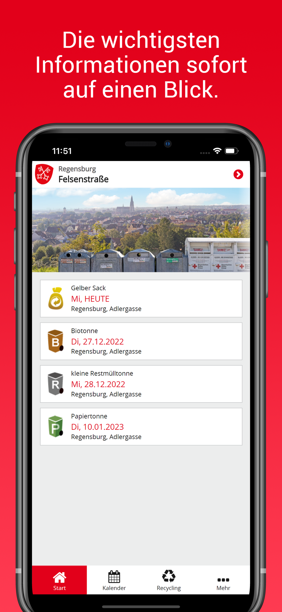Die neue Abfall-App des Stadt Regensburg. Bleiben Sie immer informiert - über Abfuhrtermine, Annahmestellen, Problemmüll und vieles mehr.