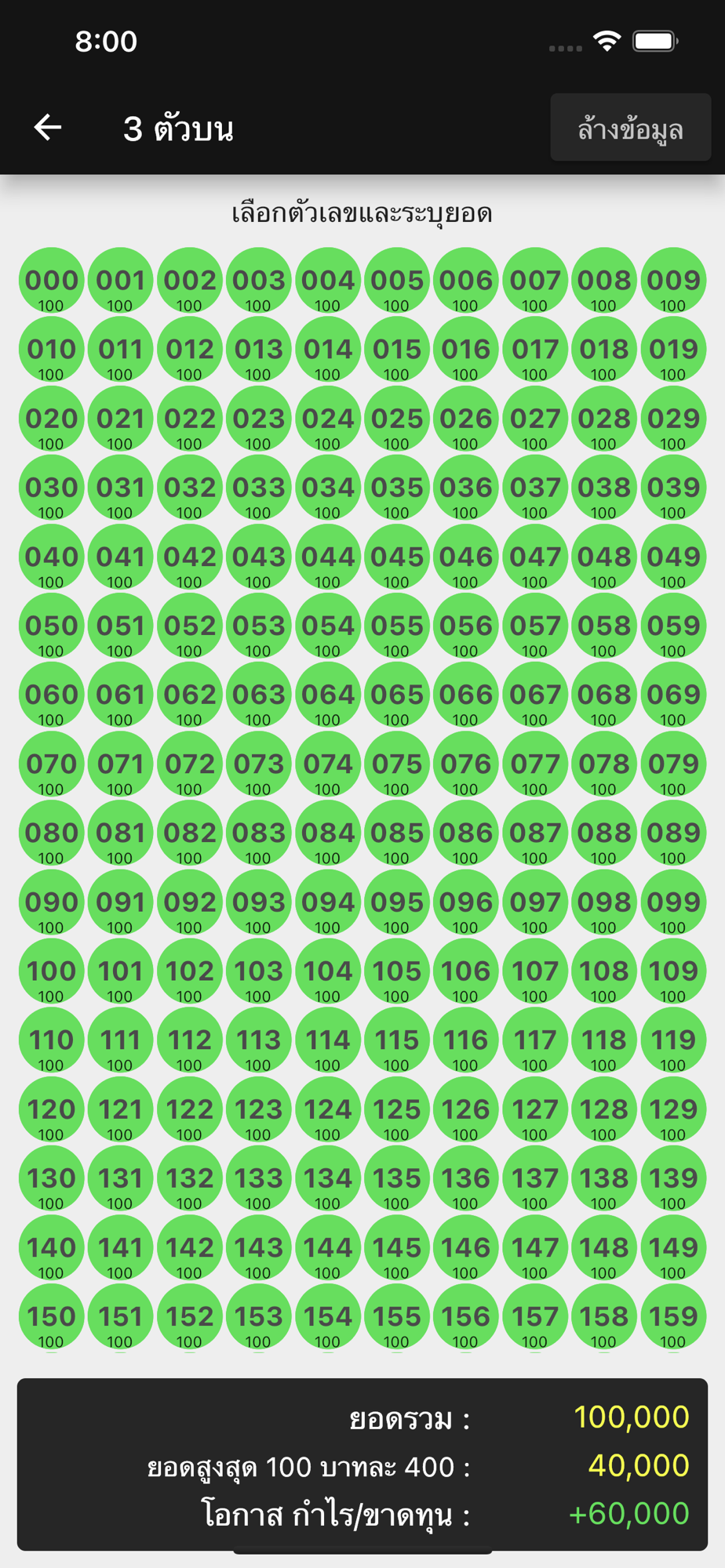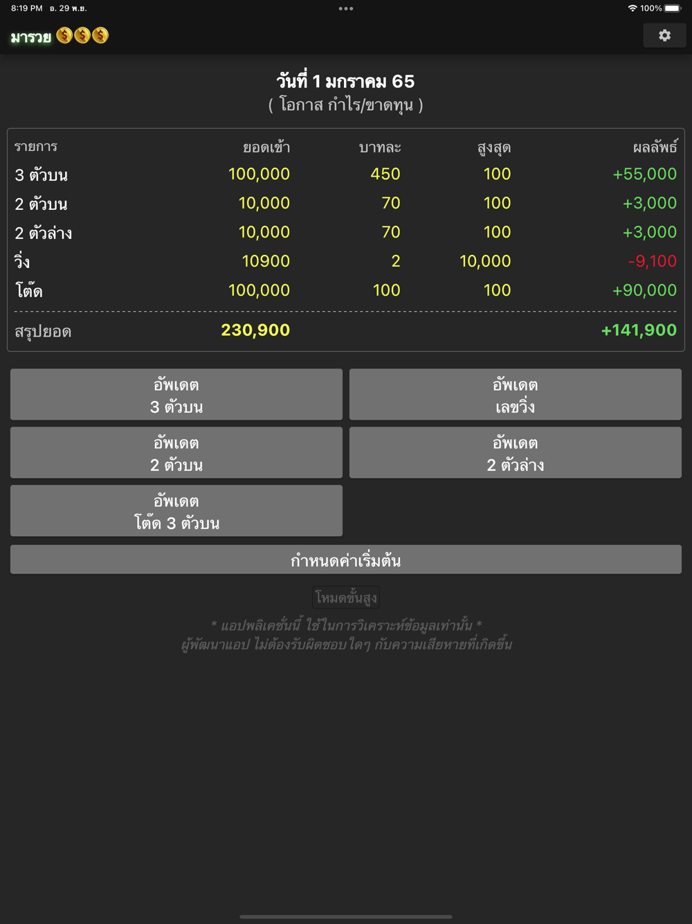 - ตาราแสดง โอกาส กำไร/ขาดทุน/ยอดเข้า/ยอดที่ซื้อเยอะสุด/ตัวเลขที่ซื้อเยอะสุด