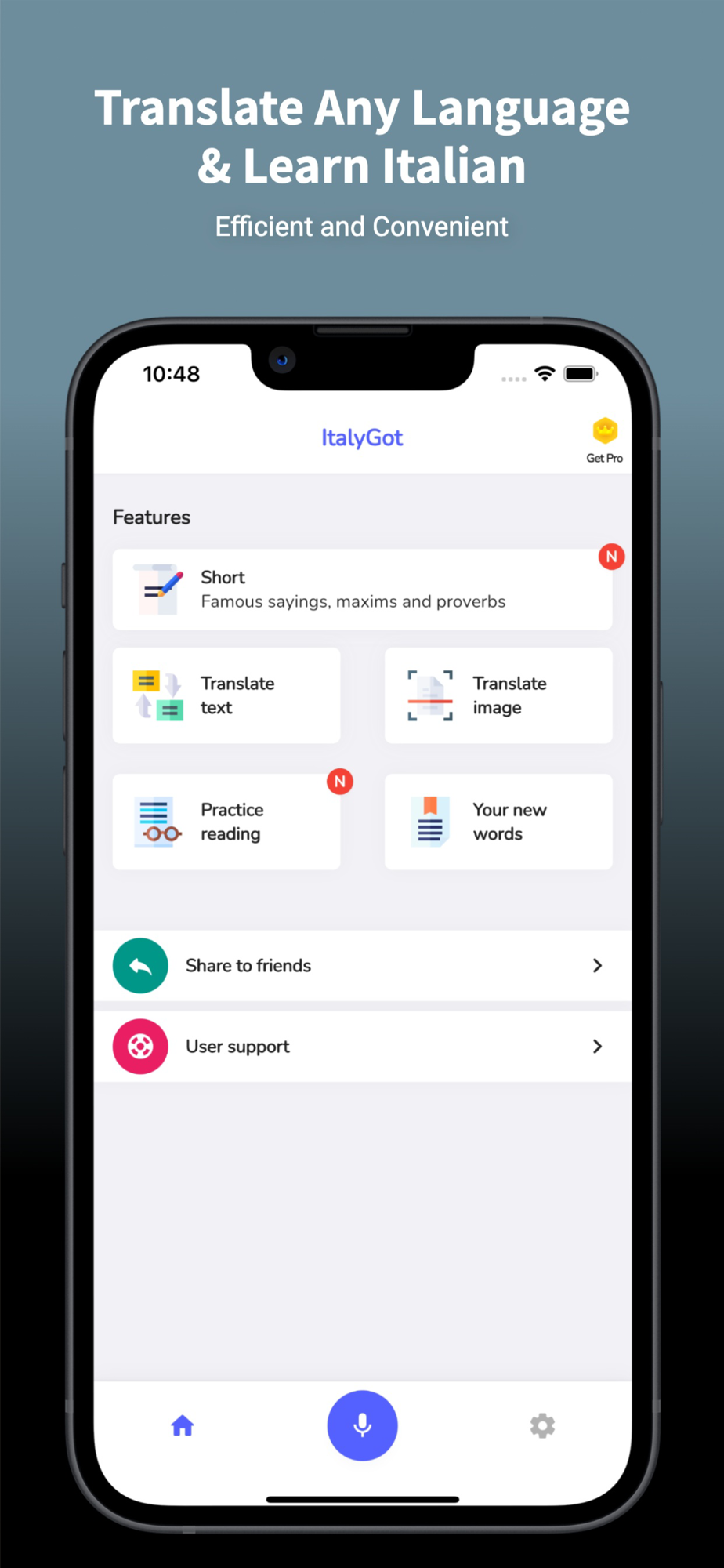 Hi ! ItalyGot is the leading Italian Translator and Learning App with a lot of outstanding features such as accurate voice translator, translate any text in Italian to english or Italian to english and extremely useful photo translating feature or practice reading, listening & reviewing Italian words.