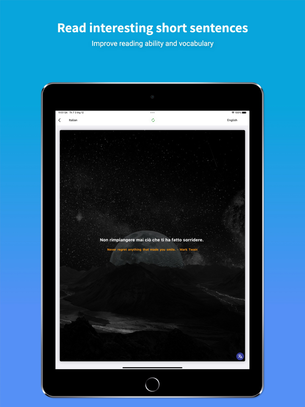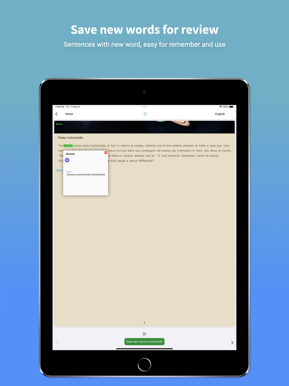 Improve Italian Vocabulary by reading short stories from basic to advanced with english translation, reviewing new word flash cards.