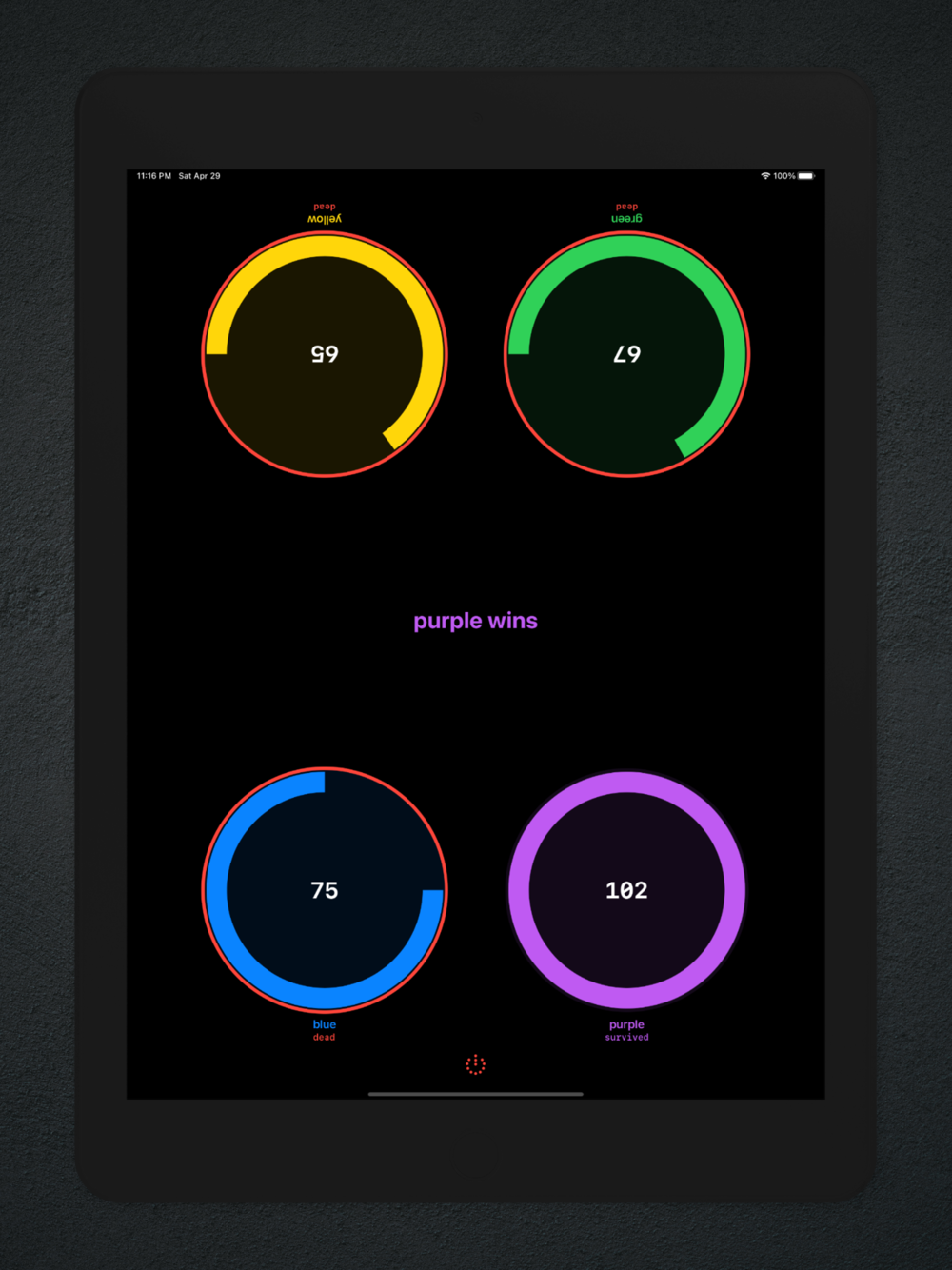 This is a single-device multiplayer "board" game. My wife said she wouldn't play with this even if they held a gun to her head. Still, it can make a good plan-B with your friends if you have nothing else to do.