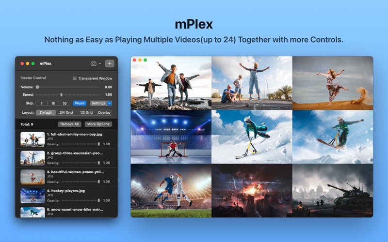 Well, here’s mPlex in rescue. mPlex is an app that can play up to 30 videos simultaneously on one screen. You can watch and compare these videos in a grid mode starting from 1 up to 30 videos. with multiple playback control for each.