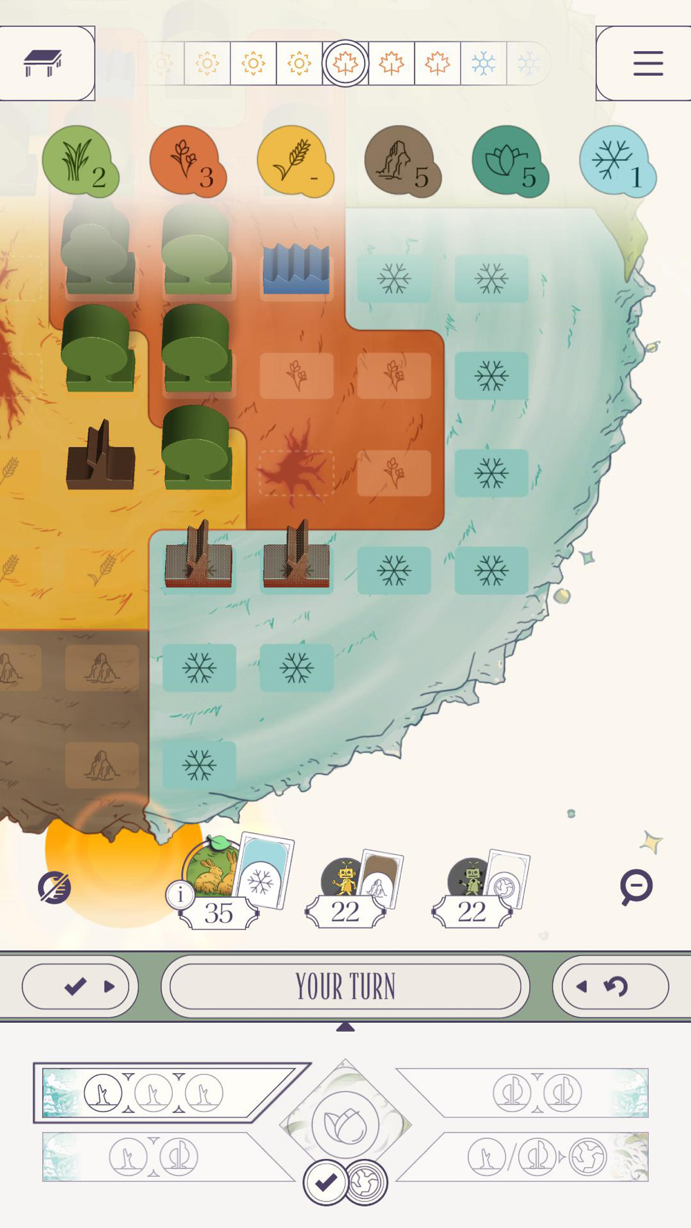 2. Grow your Trees, plant Bushes, and place Lakes to create a huge Forest, and use the power of Nature to gain extra Actions!