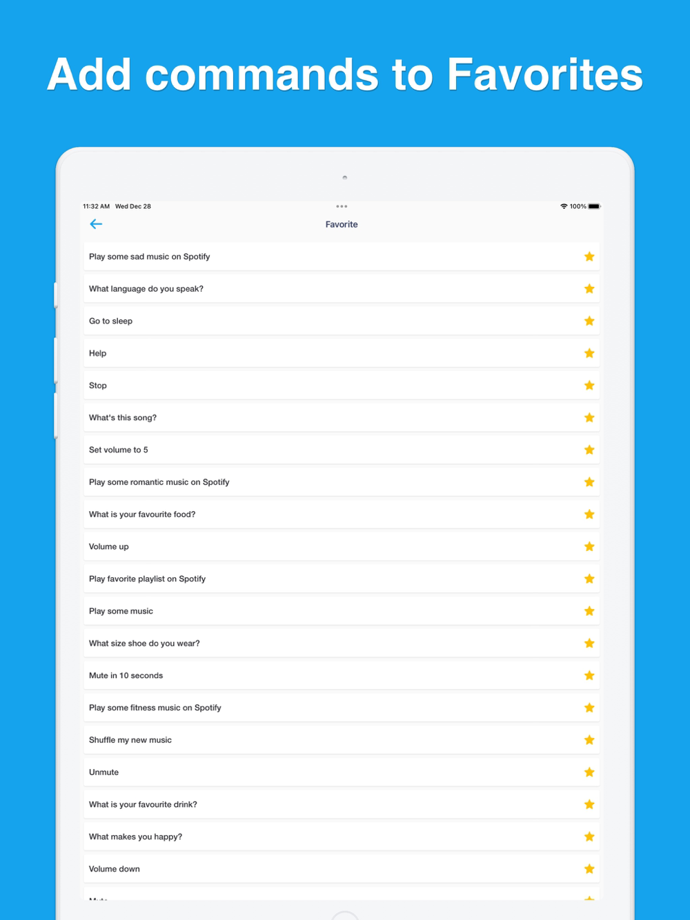 There isn't a voice assistant built into this application. You can manage Amazon Echo, Amazon Echo Dot, Amazon Echo Plus, and Amazon Echo Show using those commands.
