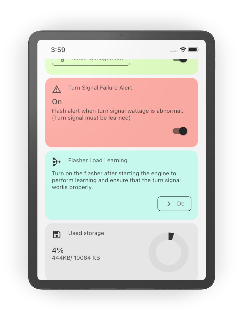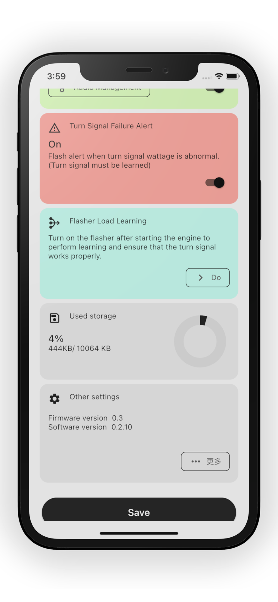 KOSO Flasher is a tool used through a mobile app to adjust KOSO's motorcycle turn signals. It connects via Bluetooth and is used to adjust the turn signal flashing frequency, interval, flashing sound effects, and volume. By connecting to the device's network, you can also upload custom sound files to use as flashing sound effects.