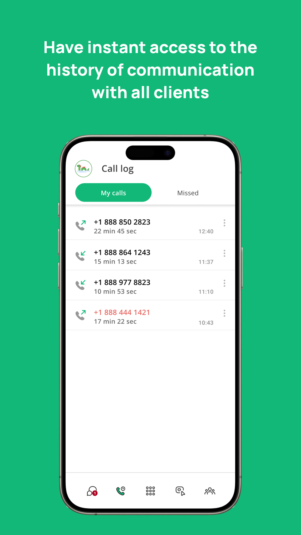3. Call history, including calls you received and missed. You can call or send an SMS to each client with one click. It is also possible to quickly copy a contact or view insider information.