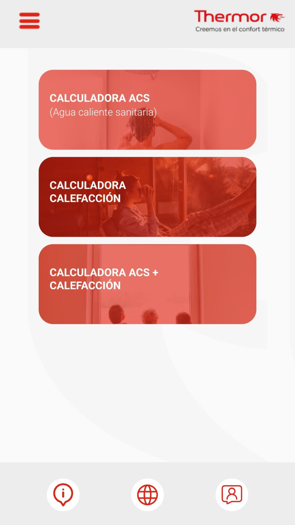 La aplicación posee tres sistemas de cálculo en función de los servicios de la vivienda que se quieran instalar: agua caliente sanitaria, calefacción o agua caliente sanitaria y calefacción, por lo que permitirá seleccionar los equipos más apropiados dentro del portafolio Thermor.