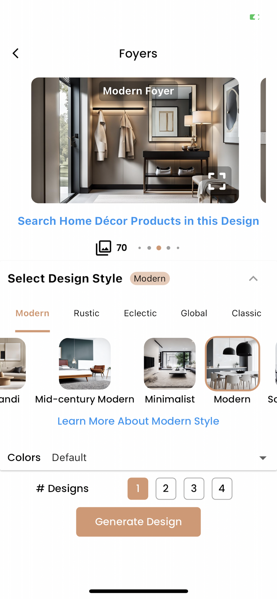 - Start with a photo of your chosen space, be it small bathrooms or grand living areas. Handle 15 distinct room types, from bedrooms to mudrooms and foyers. Explore over 35 interior design styles, including Minimalist, Scandinavian, Transitional, Modern, Mid-century Modern, Asian Zen, Country, and many more. Generate detailed renderings that artistically transform your space with selected color palettes like "Moss Green, Tan, White", and dive into home décor products showcased in design visuals using integrated visual search.