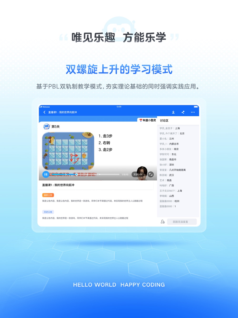 有趣的课程设计:有趣的动画场景,积分和闯关的学习形式,激发孩子学习的最大兴趣,引导孩子用编程思维解决问题。