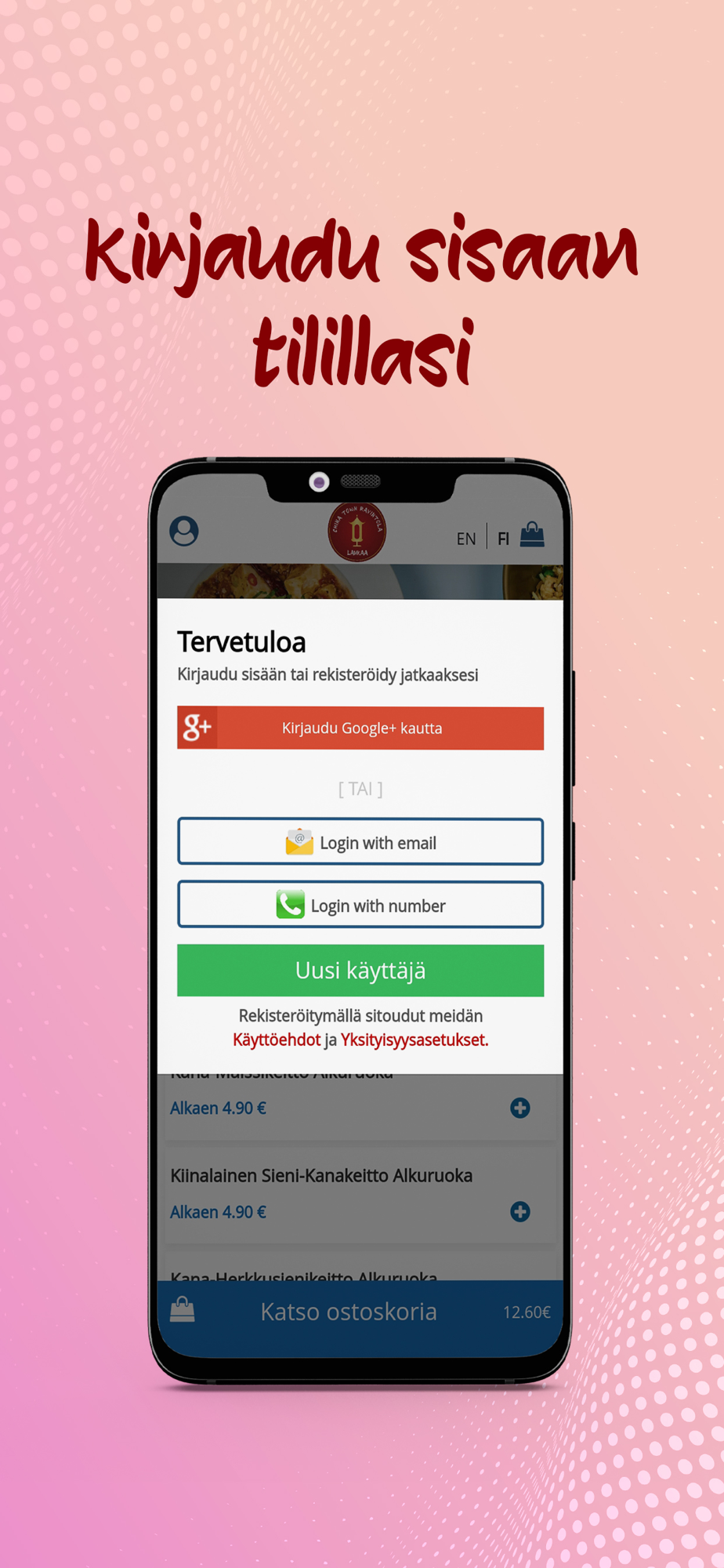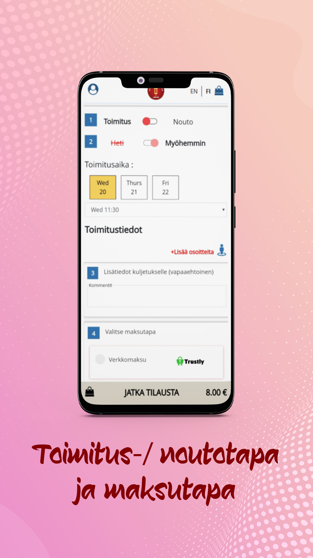 Sovelluksessa sinulla on mahdollisuus valita erilaiset maksutavat. Meillä on käytössä: