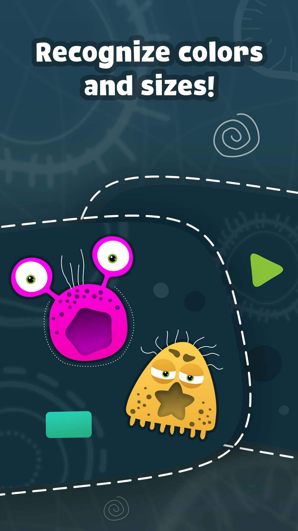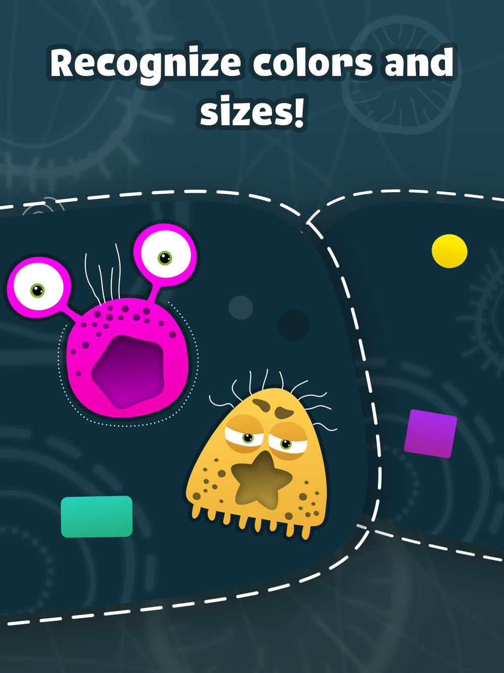 With this Kidify game we do two several at a time as usually – we introduce a complex notion (a cell) and help kids learn basic geometrical shapes and recognize colors as well.