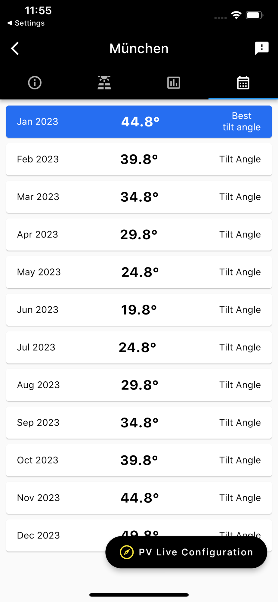 Calculate the optimum year-round and monthly tilt angle for your pv system in your location and get maximum electricity for your individual installations. Use your device to align your PV system to the calculated values. We show you the tilt and azimuth based on your real-time position and orientation.