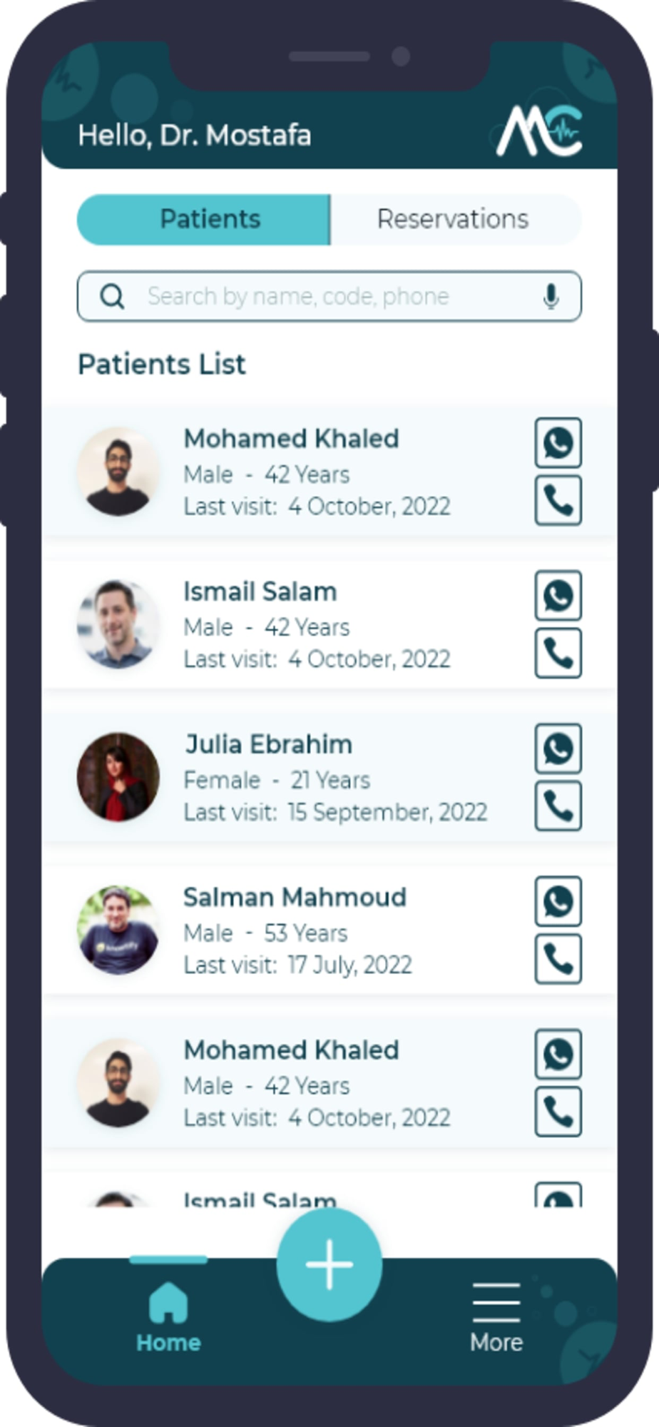 2- Patients list to find any Patient easily through searching by name, mobile and also filtering by sex and city