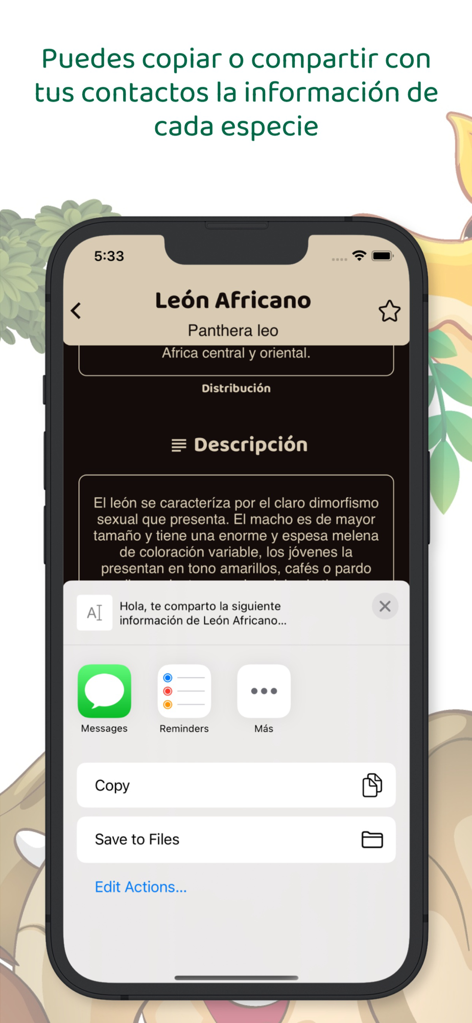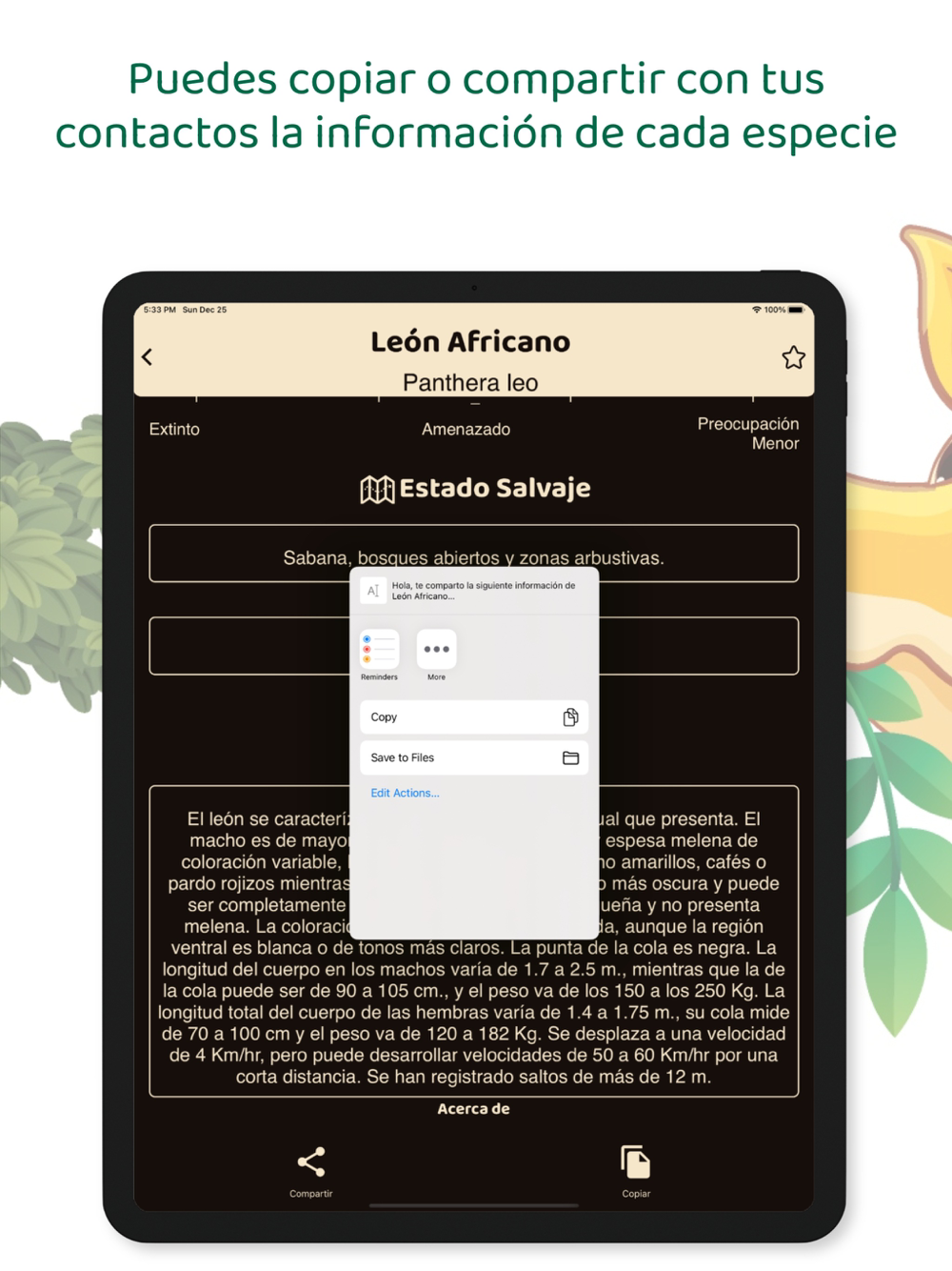 También puedes copiar o compartir con tus contactos la información de cada sección por separado o la información completa de cada especie.