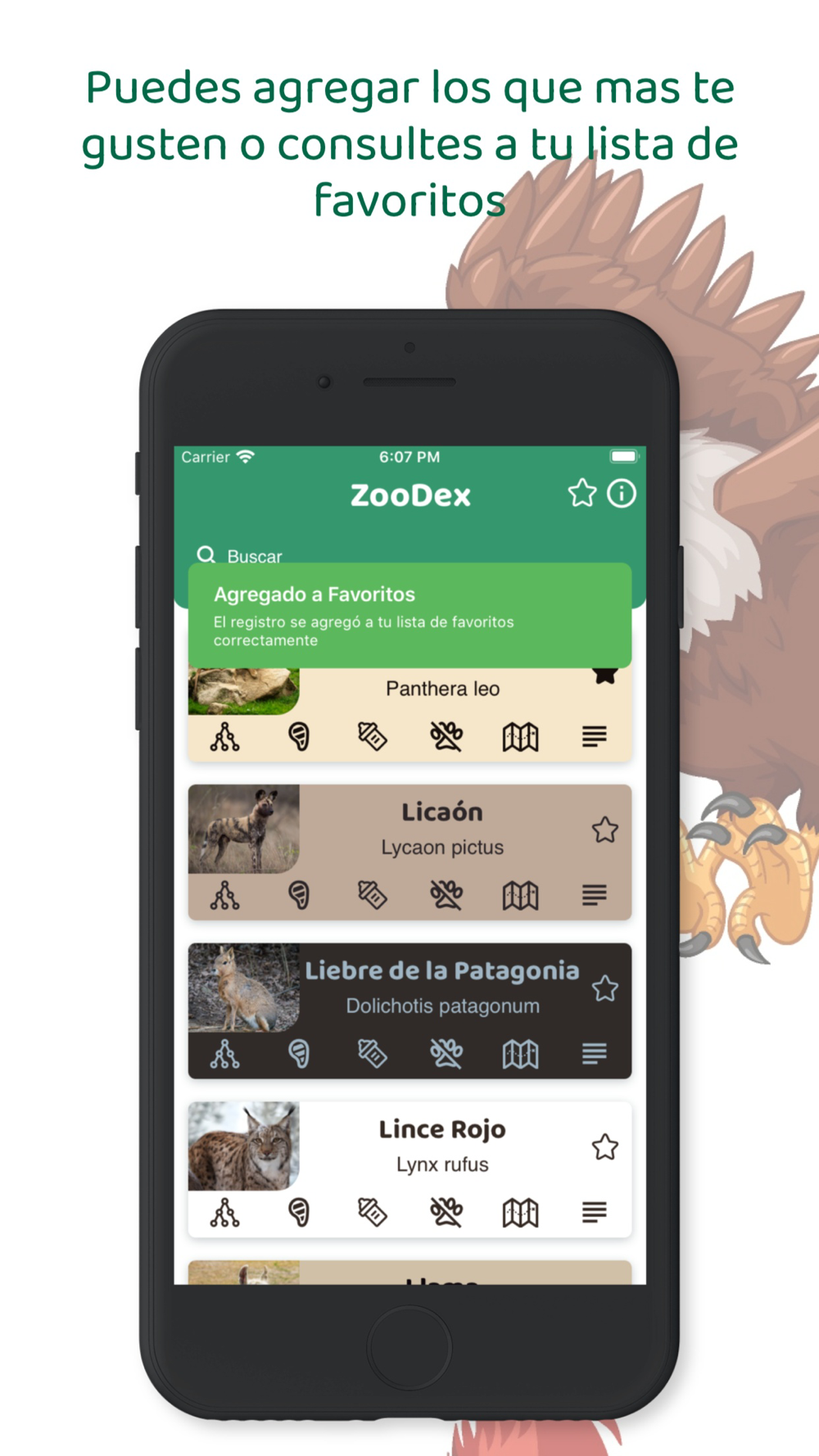 Además de poder agregar los animales que mas te gusten o consultes a tu lista de favoritos.