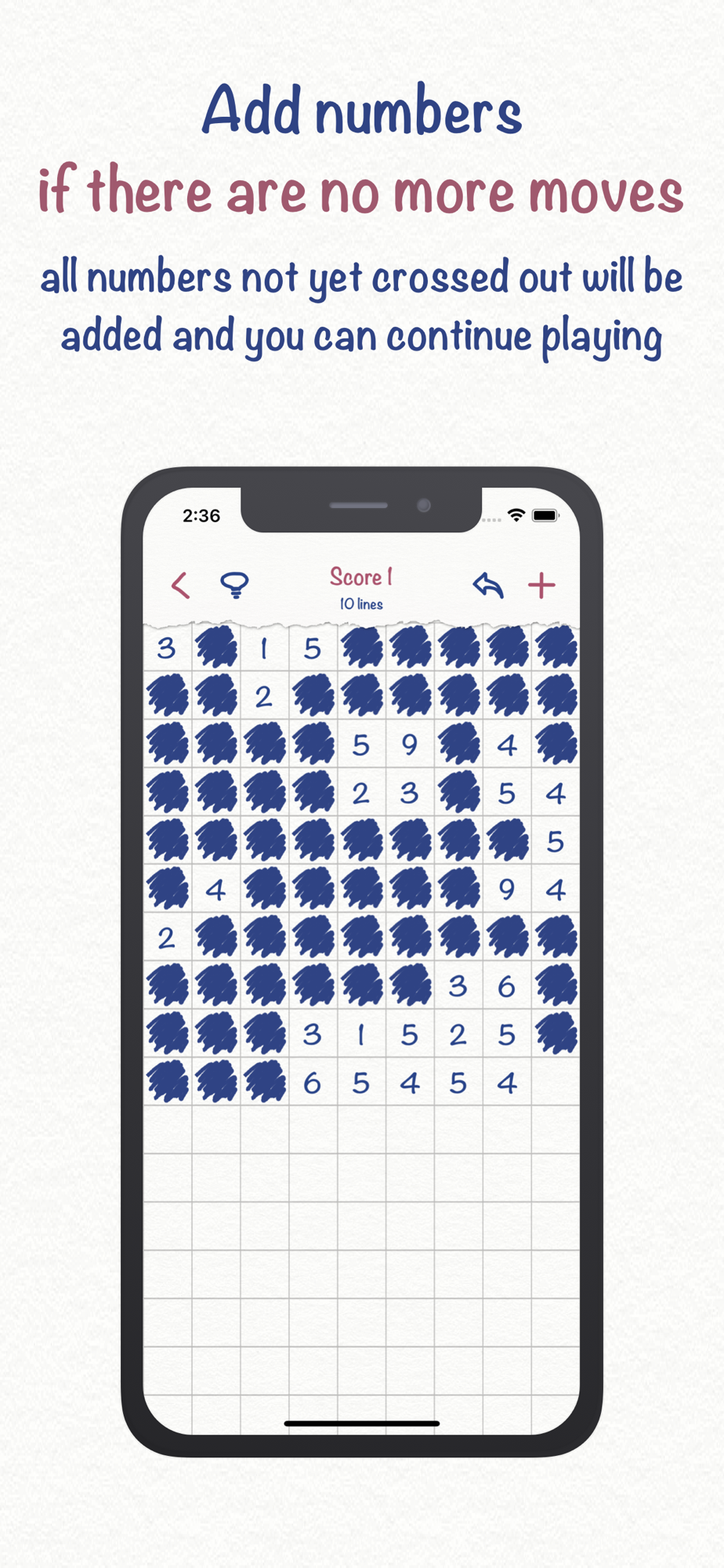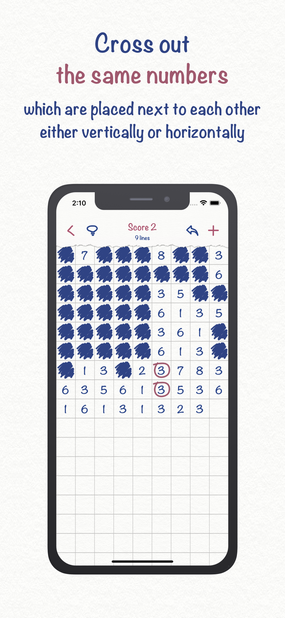 The goal of the game is to cross out all the numbers. Only the same numbers and giving 10 in total numbers, standing next to each other horizontally or vertically, can be crossed out. If you can't find the next move - hints will help. If there are no more moves - you need to add numbers and continue playing.