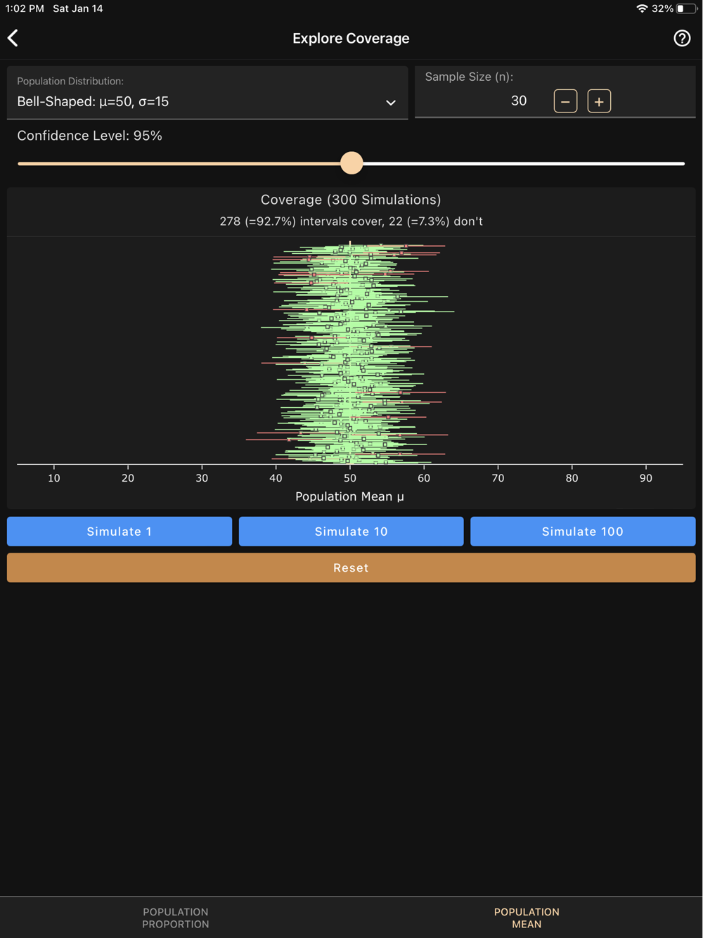 Coverage and Errors: Explore what 95% coverage for a confidence interval for a population mean or proportion implies.