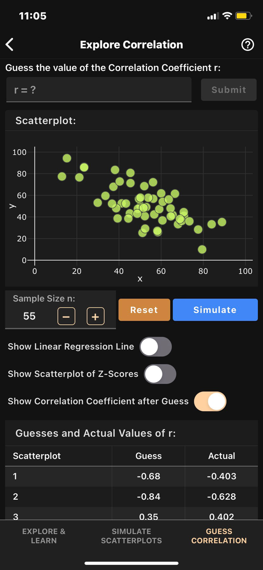Explore Correlation/Linear Regression: Create (and delete) points in a scatterplot by tabbing on the screen. Show the regression line or residuals. Simulate scatterplots and guess the correlation coefficient.