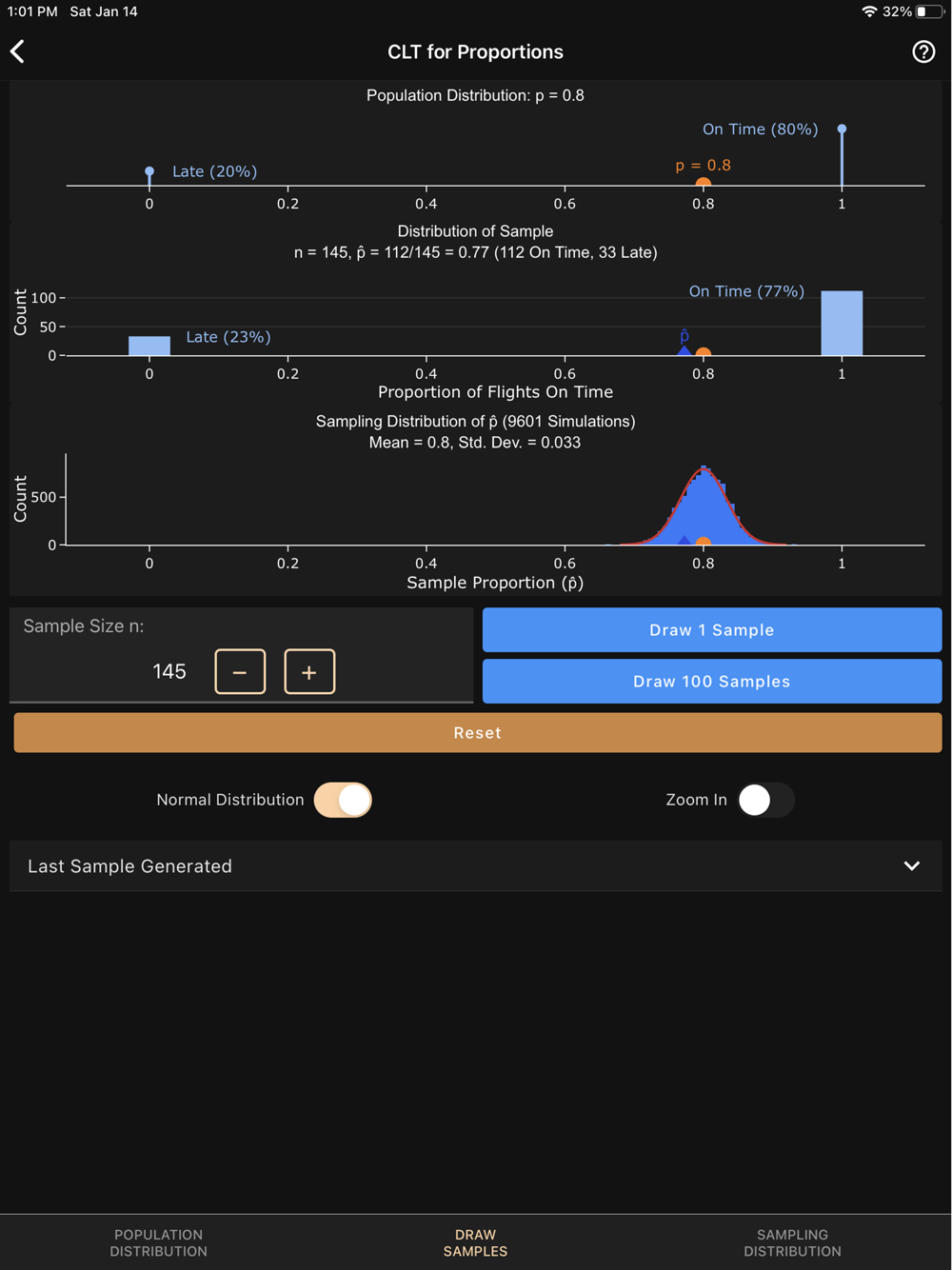 Visualize how the sampling distribution builds, step-by-step. Explore the effect on the sampling distribution as you increase the sample size. Overlay the normal distribution.