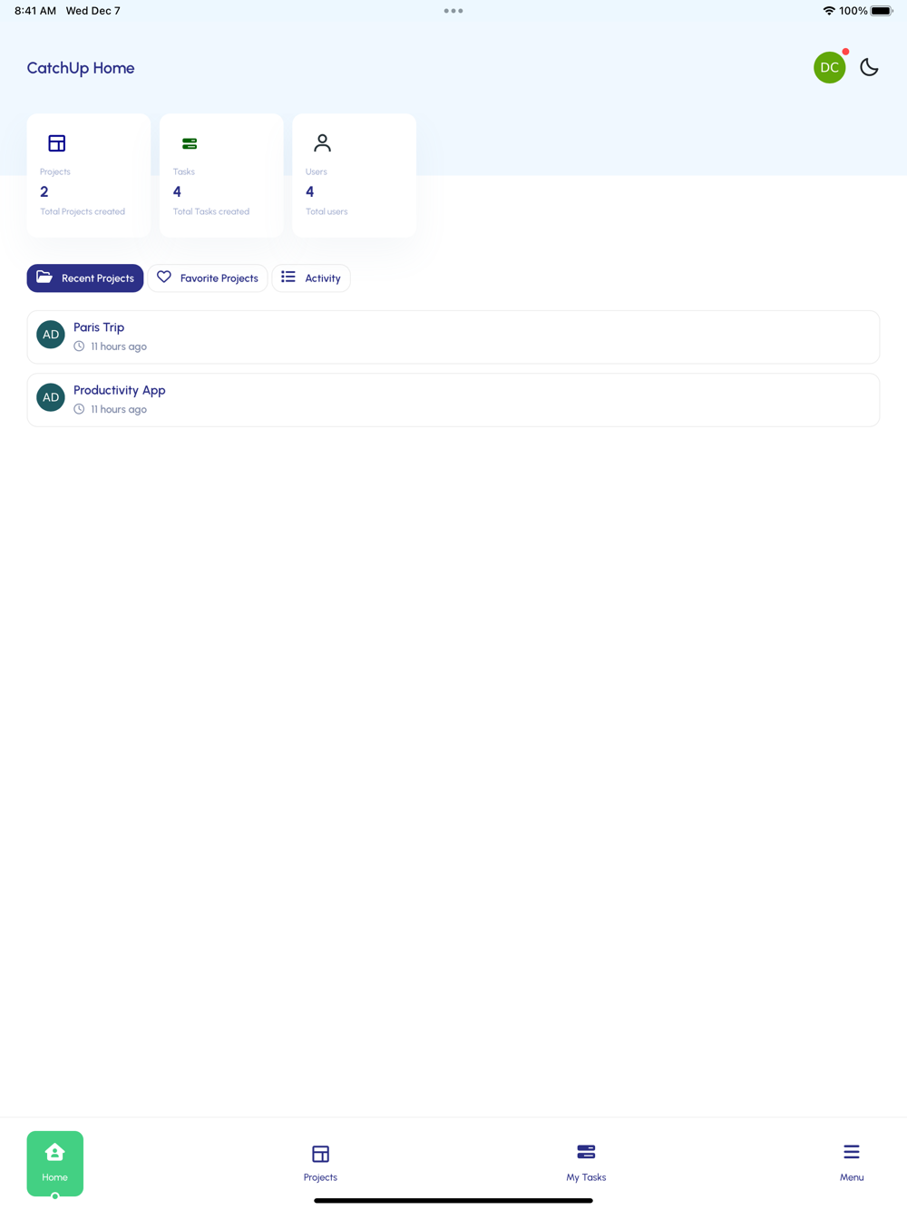 - Project Management & Task Scheduling: CatchUp organizes work into projects linked to specific clients. Each project can have multiple tasks and each task can have multiple action items.
