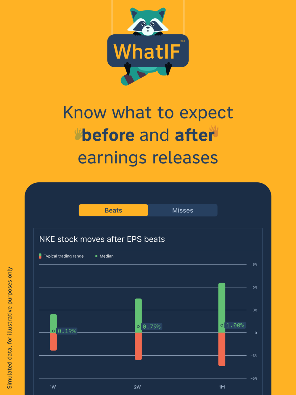 Discover recent and upcoming earnings release with WhatIF: Earnings app. Before earnings, find out where the stock could go depending on a beat, meet or miss. After earnings, find out where the stock could go after one week, two weeks or one month based on similar releases in the past.