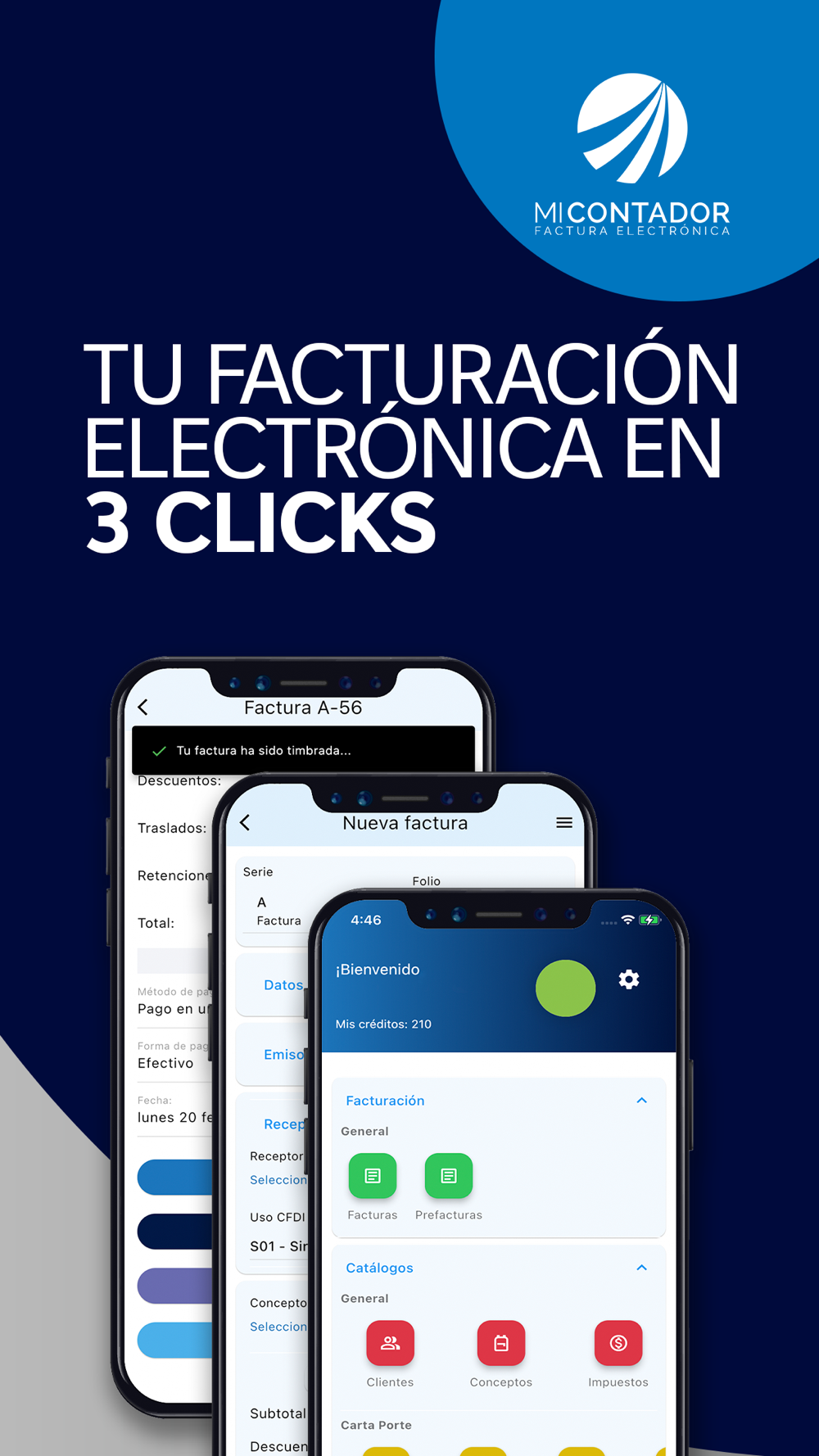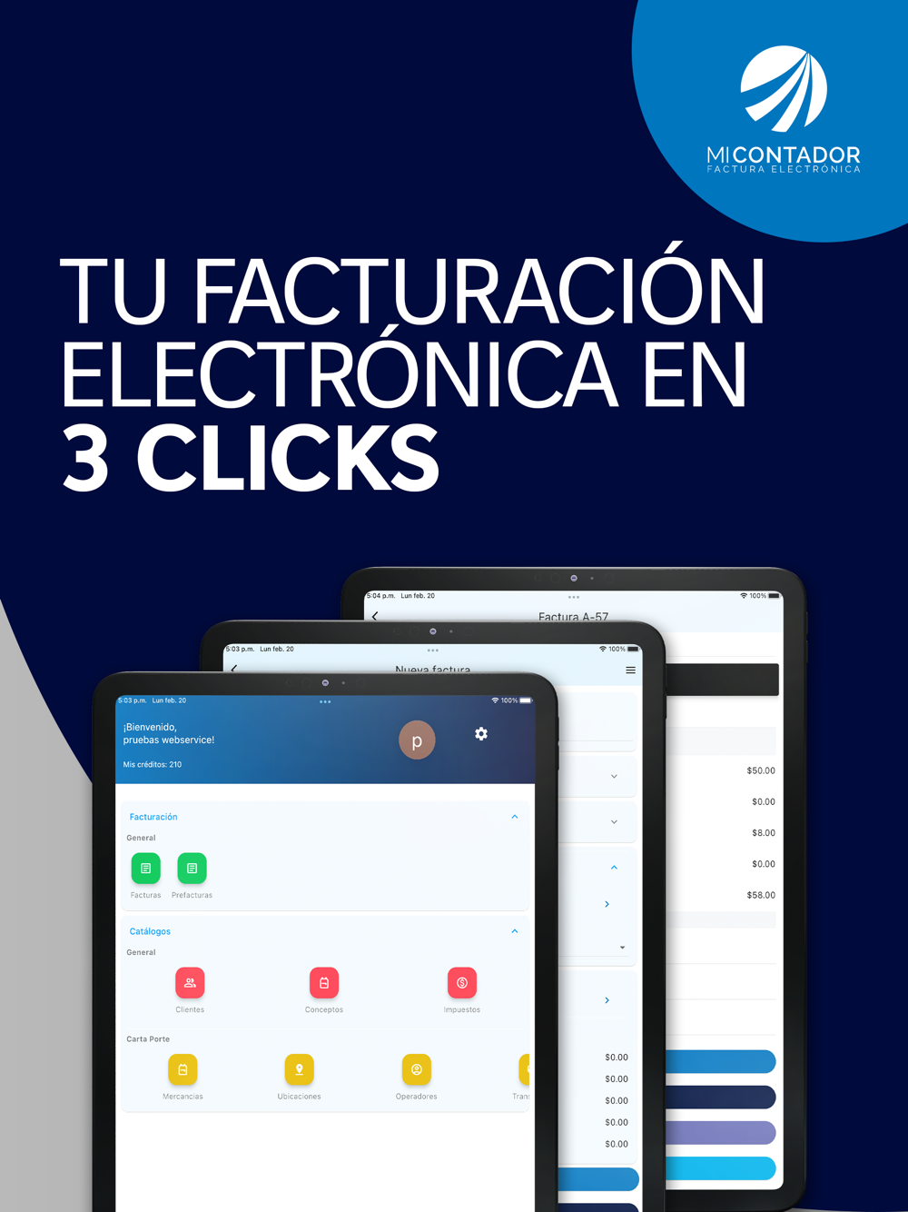 Mi Contador es una aplicación de facturación electrónica a la vanguardia, te permite generar tus comprobantes fiscales digitales por internet desde tu móvil, consultar tus catálogos de clientes, crear nuevos conceptos, añadir impuestos, consultar tus facturas emitidas y recibidas, además incluimos acceso a soporte técnico incluido sin costo adicional, todo esto en un solo lugar. ¡Solo tienes que contactar a tu distribuidor para obtener tu acceso!
