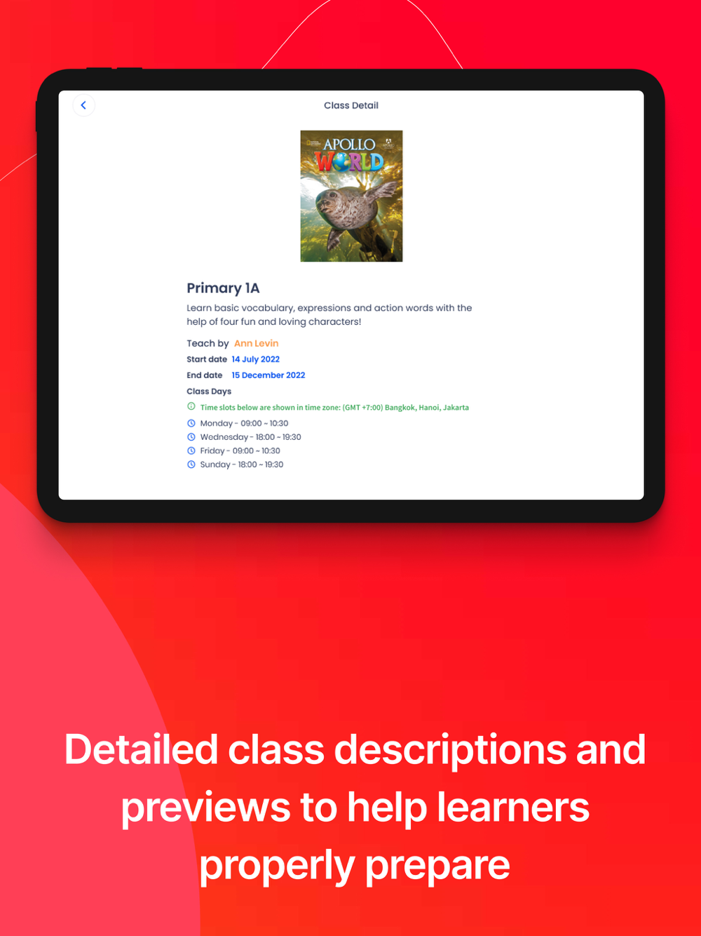 Dashboard with lesson schedule, self-scheduling/re-scheduling, results, progress, feedback