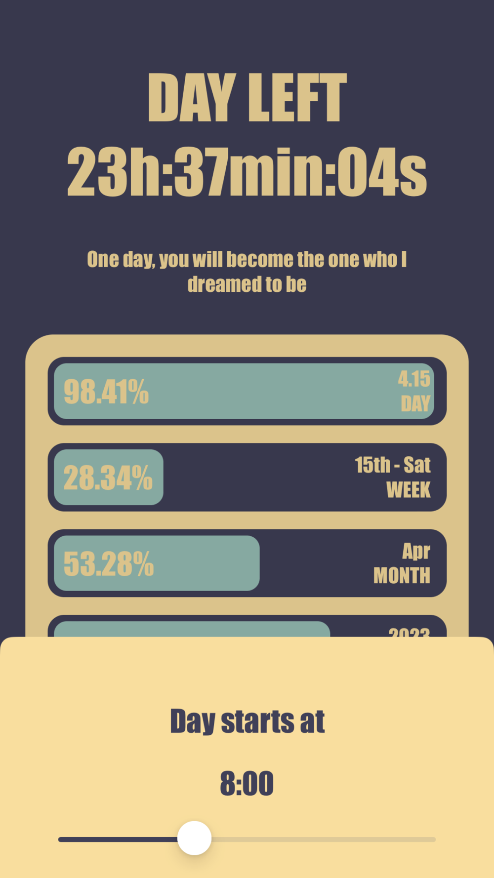 Day Wayfarer is an app that helps users track their life expectancy. It displays how much time is left in a user's day, week, month, year, and overall life expectancy through a progress bar. With Day Wayfarer, users can better plan their time and consciously make the most of each day to achieve their life goals. It is a simple and easy-to-use app that not only motivates users to live positively, but also reminds them to cherish time.
